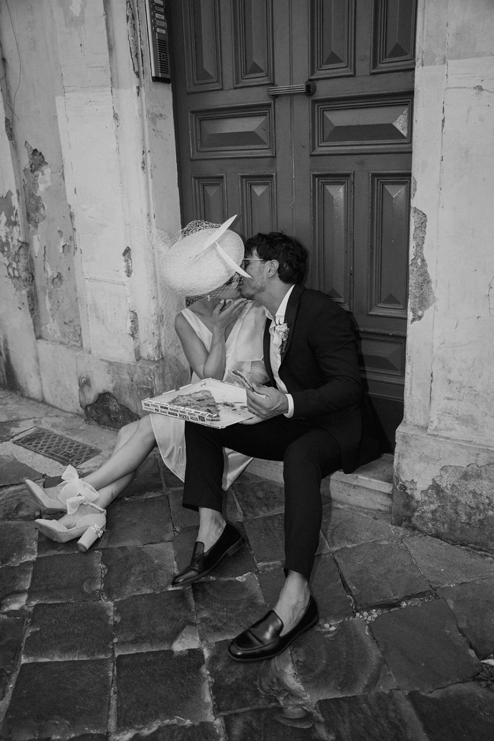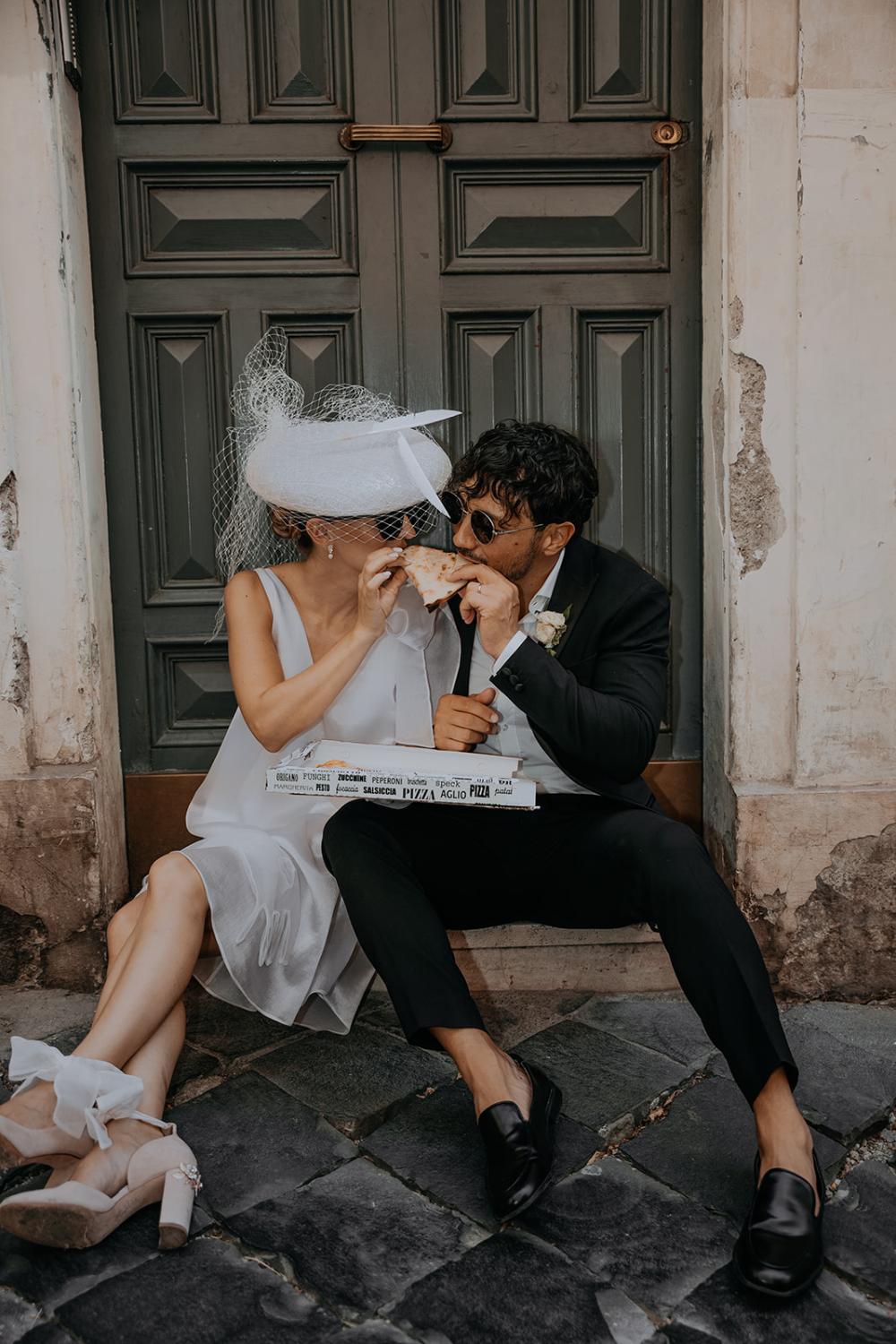 “The streets of Rome. Perfect for romantic couples who want to have a fun and intimate wedding or honeymoon. We wanted to create a playful elopement featuring two very Italian elements, Vespas and pizza. Our models were newlyweds on their actual honeymoon so we wanted a scenario where they could be natural allowing their true connection to be shown. We hired a Vespa and photographed the models riding and enjoying the city. They stopped for pizza and enjoyed a relaxed lunch together. These are two fun and inexpensive things any couple can do in Rome, on their wedding or honeymoon. The shoot shows how beautiful the simple things are.”