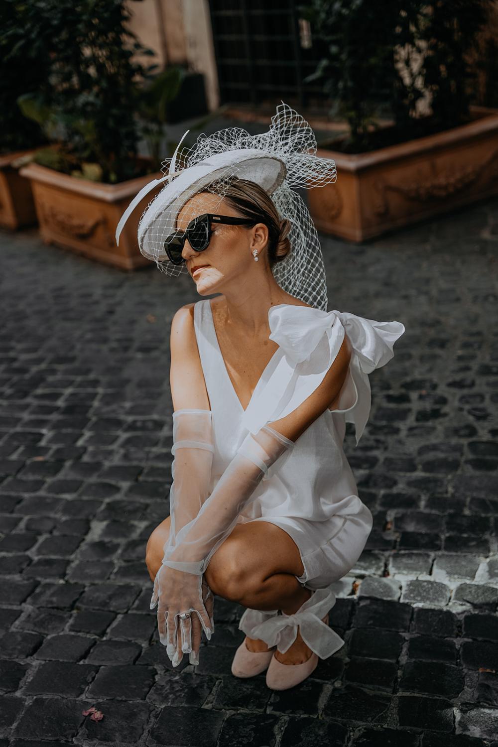 “As we were using a Vespa I wanted to create a fun but classic bridal look for the model. I chose a short wedding dress and styled it with long tulle gloves and a stunning bridal hat. The look was comfortable and practical for riding a Vespa and sitting to eat pizza but it still felt special. It was an ideal look for a destination elopement as the items were light, and easy to pack but still looked special. The couple had his and her jewellery made that they could wear forever and both outfits could be re-worn in the future for other events.”