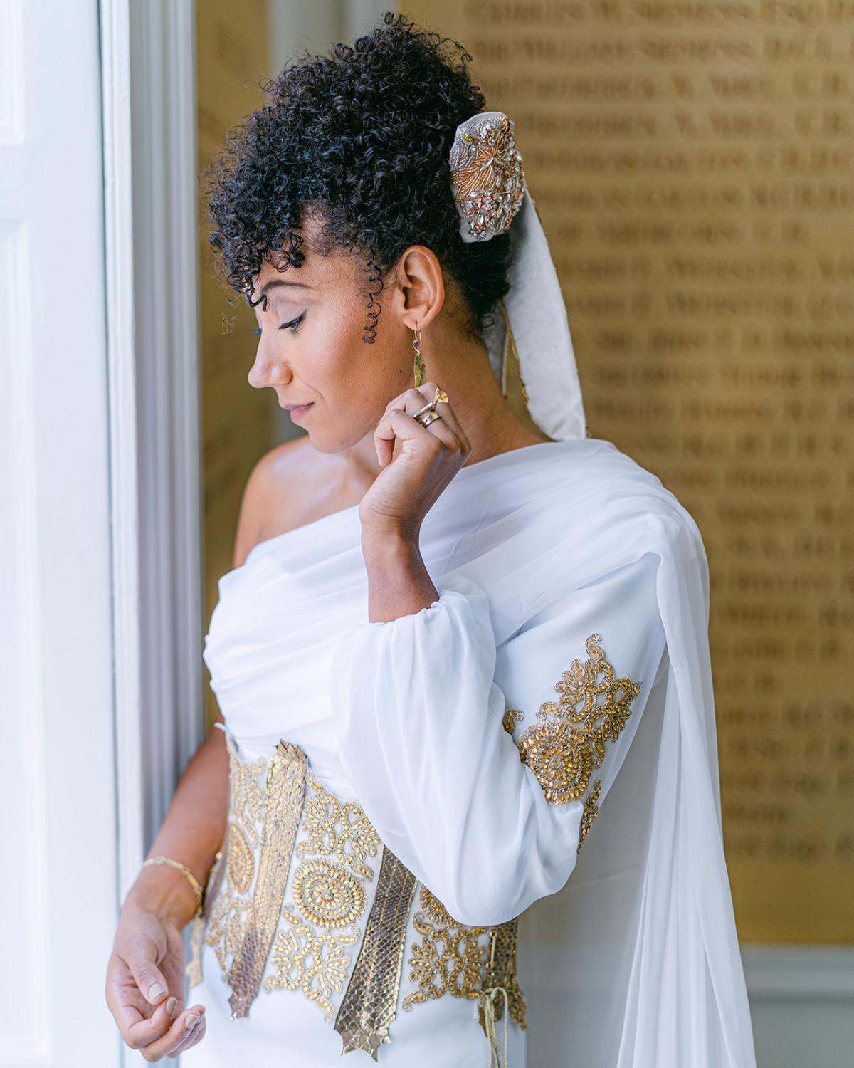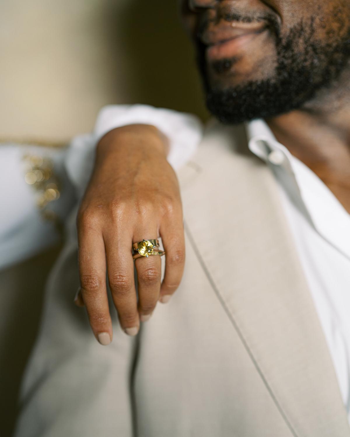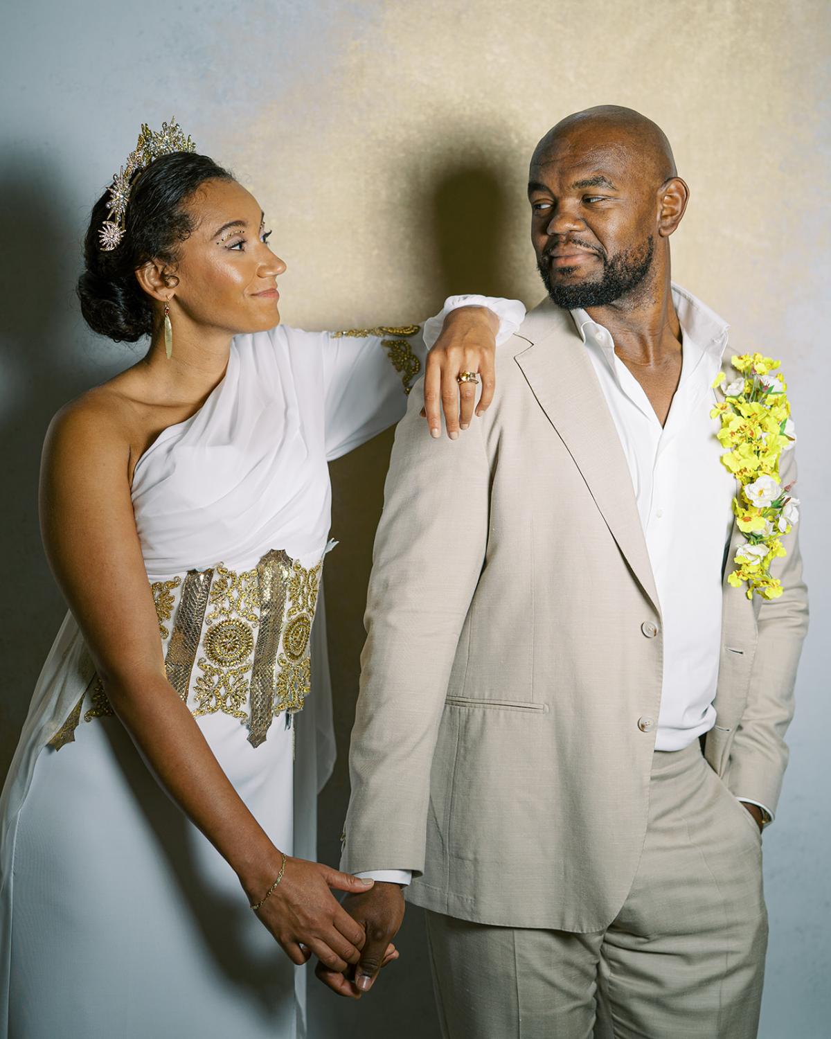 Jewellery – “For a fabulous Goddess-like look on your wedding day, nothing compares to bespoke jewellery handcrafted with you and your theme in mind. Renowned Parisian designer Catherine Marche brought this vision to life, styling both the bride and groom with textured wedding rings chosen to match while evoking antiquity. To complement her epic look, the bride wears exquisite solid gold earrings, handmade from upcycled jewels and set with vibrant red Rubellite tourmalines to symbolise love and passion. Her sculptural engagement ring is a striking sunshine yellow Citrine set in gold. Plan ahead and allow 6-12 weeks for bespoke creations to ensure your jewellery, which is the only thing you will wear for years, is as unforgettable as your day. Whether custom-made or ready-to-wear, Catherine’s designs exude her unique fashion flair which will make your wedding day truly special, creating memories that last a lifetime.”