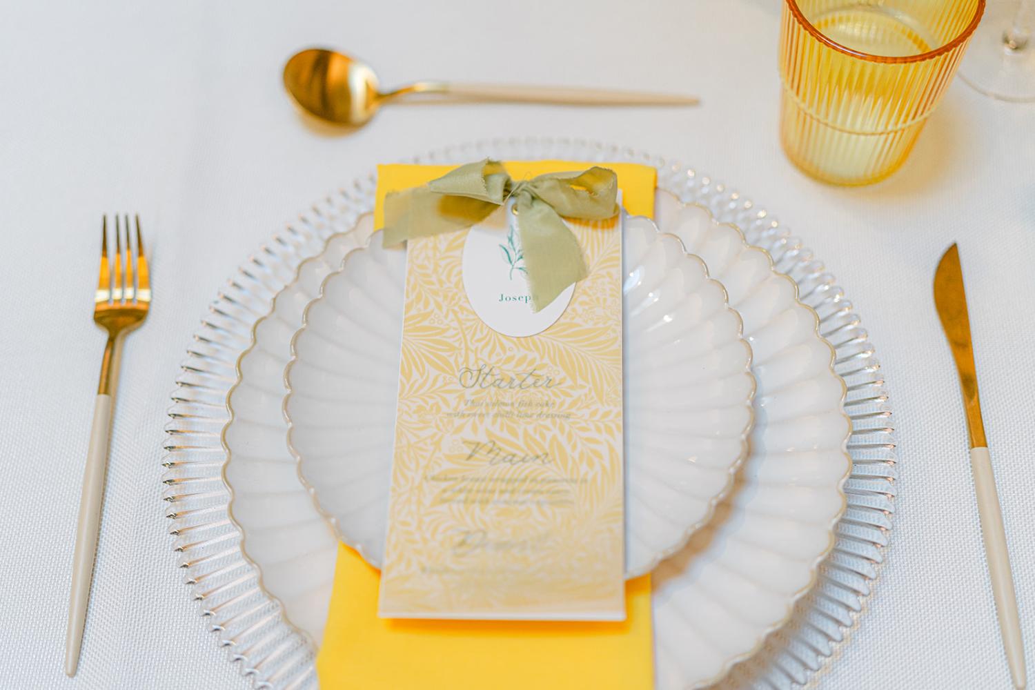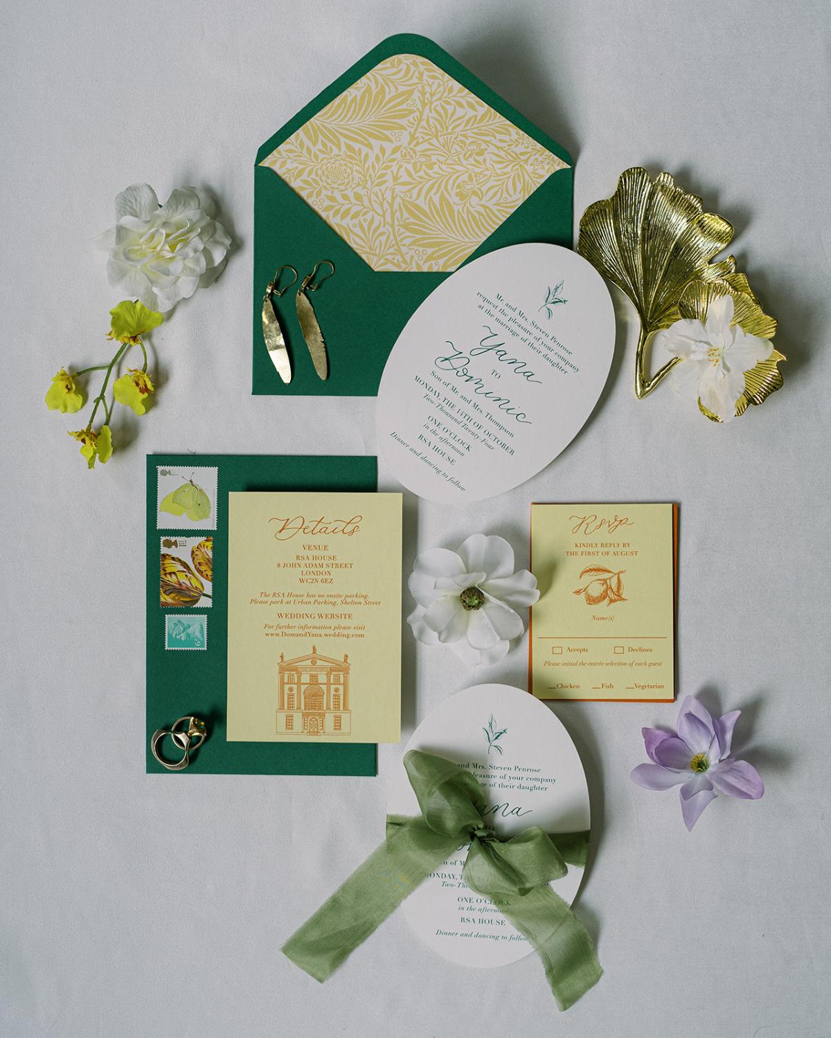 Stationery – “To create this luxurious stationery suite, I drew inspiration from William Morris’s timeless “Larkspur” pattern. Using a bold yellow version, I incorporated it as envelope liners and a striking vellum overlay on menus, balancing its vibrancy with minimalist typography and hand-drawn illustrations, including a bespoke sketch of RSA House. Couples can achieve this look by pairing bold patterns with clean, modern design elements for a refined yet personal feel. The menus were layered with translucent vellum, secured with eyelets, and tied with hand-dyed silk ribbon in chartreuse green. This layering technique adds texture and dimension to any table setting. Oval place cards tied to menus mirrored the suite’s leaf motif, bringing cohesion to the overall design.