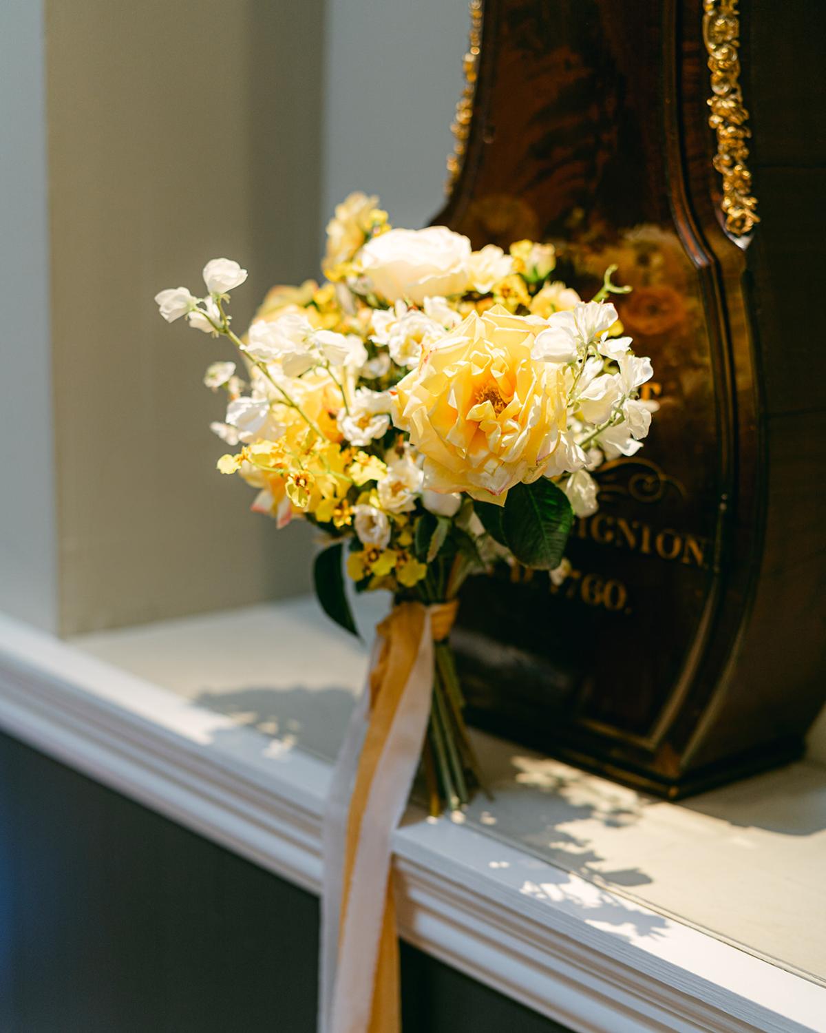 Flowers – “Silk florists Fleur de la Couture achieved this whimsical ceremony look with a dramatic horseshoe of meadow flowers that flowed into the aisle, for an immersive botanical experience. A feature broken arch beautifully framed the fireplace. For the reception, the floral designs were grand and luxurious, with statement-raised centrepieces and a garland of bud vases with nestled candles. Totally divine! You wouldn’t believe it, but all flowers and foliage used in this wedding are faux, beautifully replicating natural stems and achieving stunning installations without the waste from single-use fresh flowers. The joy of choosing silk flowers is treasuring your bouquet forever, with many brides displaying theirs in a vase at home after the wedding. Brides are encouraged to contribute to the design of their bouquet, helping to select their favourite flowers, with Yana falling in love with the sunshine yellow garden roses used in her bouquet.”