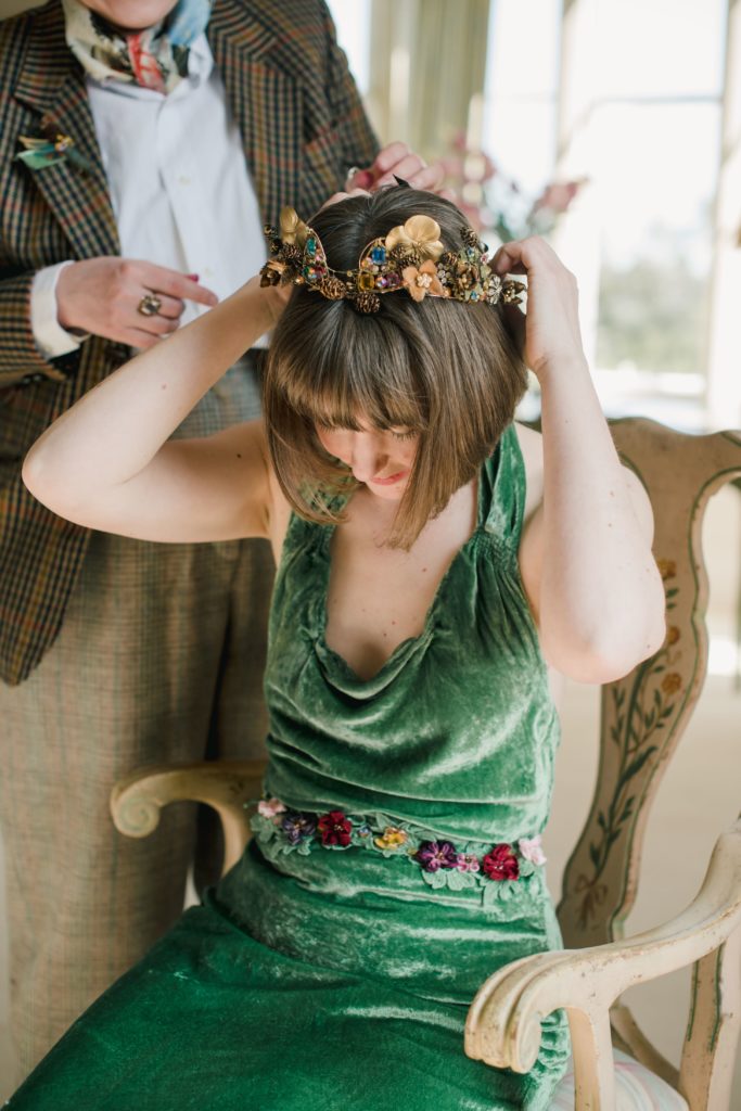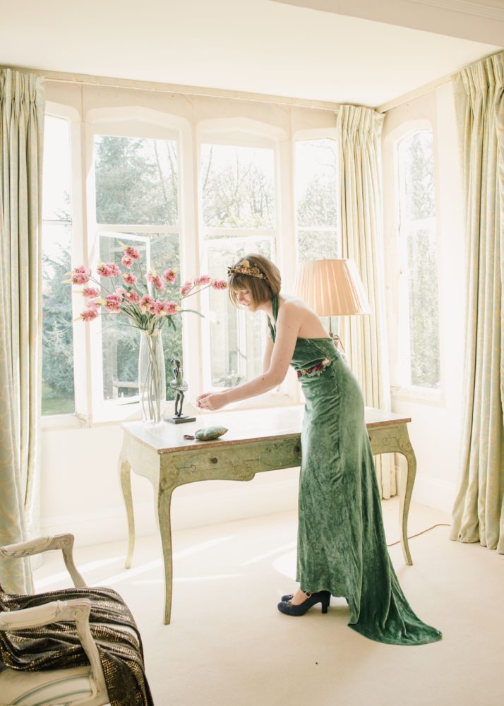 Photographer – Camilla Reynolds Photography @camillareynoldsphoto / Venue – Matara @mataracentre / Dress – from Hannah Wyman at The Textile Treasury / Dress dyed with botanical dye as per directions from Babs of Botanical Inks @botanicalinks / Ribbon flowers (on belt) by Jan Knibbs of Atelier 19 @atelier19chelt / Bride’s tiara Gemma Sangwine Millinery & Headwear @gemmasangwine / Florist – The Cotswold Posy Patch @cotswoldposypatch / Makeup – Aine Thomas MUA @ainethomasmua / Hair – Juta Zorubiene Bridal Hair @jutazorubiene / Grooms suit – Jacket by Emily McNair @emmiemcnair / Stylists Delight Vintage Tea set Hire @delightvintageteasethire