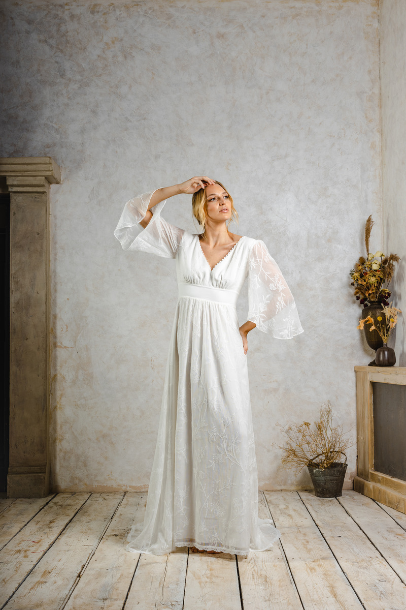 If you’re looking for something more boho this dress by Indiebride London is perfect. With dramatic sleeves and a laid-back vibe, it would suit a relaxed winter wedding with a cosy and intimate vibe. Indiebride London is a bridal wear brand with sustainability at its core. They offer brides a laid-back approach to purchasing the most important dress of their lives. All their designs are bohemian-led with a hint of romantic vintage vibes. Their dresses are soft-structured which ensures cosy comfort throughout the long day of celebration