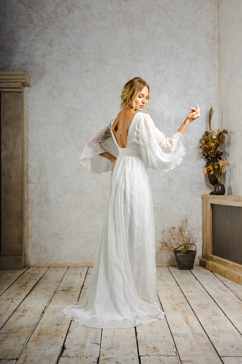 Layer on some love with this art deco inspired dress by Maudika Bridal. It’s the perfect two-piece for draping your shoulders by day and then removing it for a whole new simple and chic look for your evening reception! MaudiKa Bridal is a small indie brand that designs and creates boho and vintage-inspired wedding gowns, using sustainable fabrics and mixing retro inspiration with modern trends. All of their dresses are unique designs and handmade. Go and check them out!
