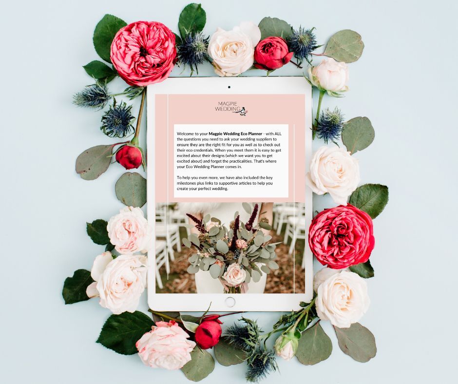 Welcome to The Magpie Wedding Eco Planner – with ALL the questions you need to ask your wedding suppliers to ensure they are the right fit for you as well as to check out their eco credentials. When you meet them it is easy to get excited about their designs (which we want you to get excited about) and forget the practicalities. That’s where your Eco Wedding Planner comes in.