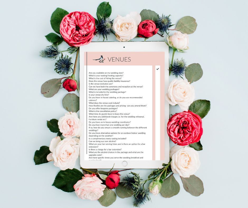 🖤 Questions for venues, catering, photography, celebrants, dress/suits, accessories, stationery, flowers, video, entertainment, planners and stylists