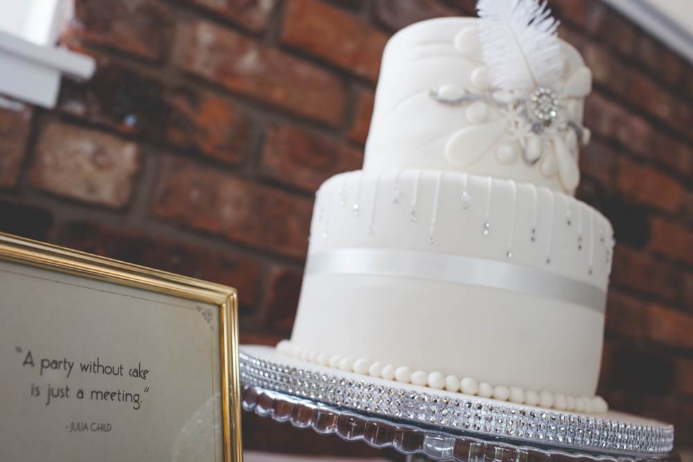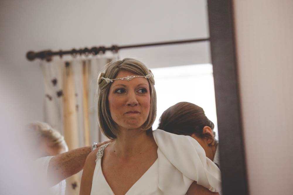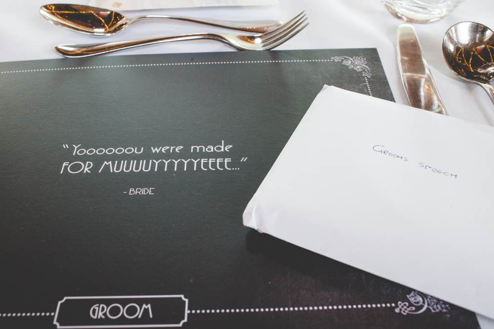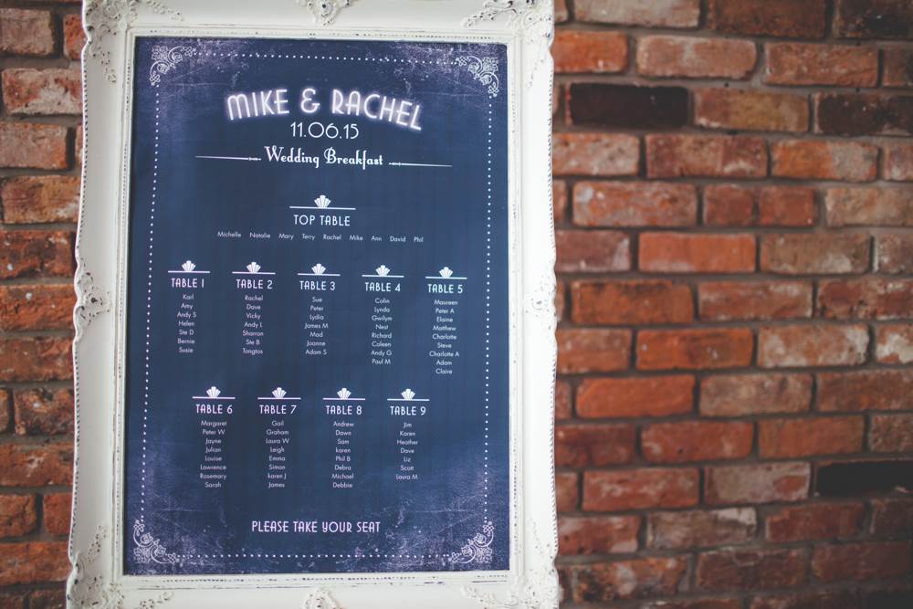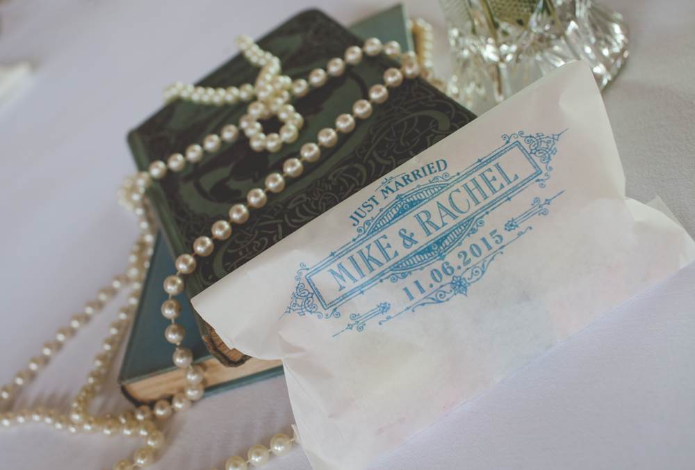 “I’ve always had a thing about the 1920s, the Charleston and art deco. I love how elegant, artistic and daft the era was, the women seemed to have a rebellious streak too which appeals! I like to think I’m all of the above! We had a 20s/silent movie theme running through from the invites to the placemats I designed (they included one-liners from our favourite comedians) and old picture frames with messages in them. We hung old weddings photographs of family members and friends families. The bridesmaid dresses and my own Enzoani dress were quite vintage/20s (which was quite accidental, I just happened to fall in love with a 1920s style dress!). The cake was based on a 20s vintage design. We also hired vintage props including vases, a suitcase for cards, beads and an easel for the table plan.”