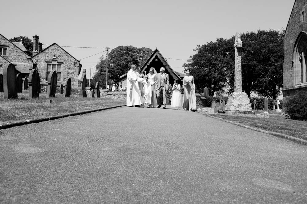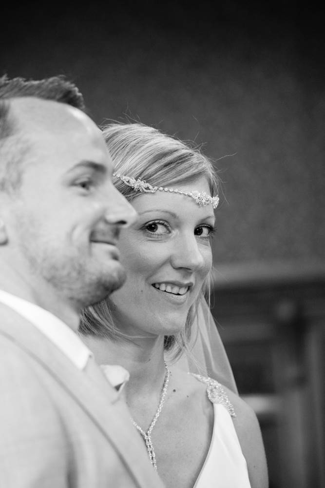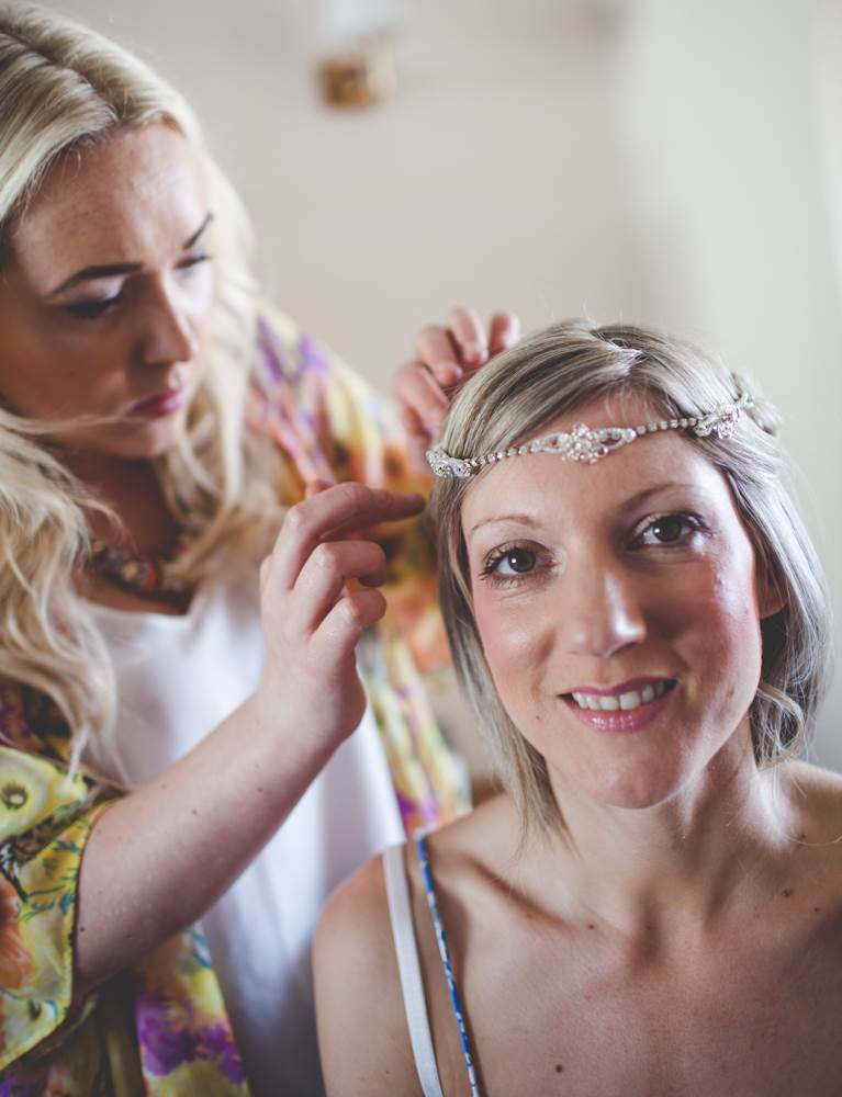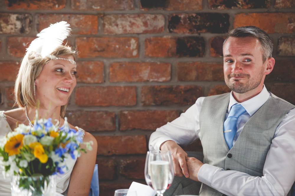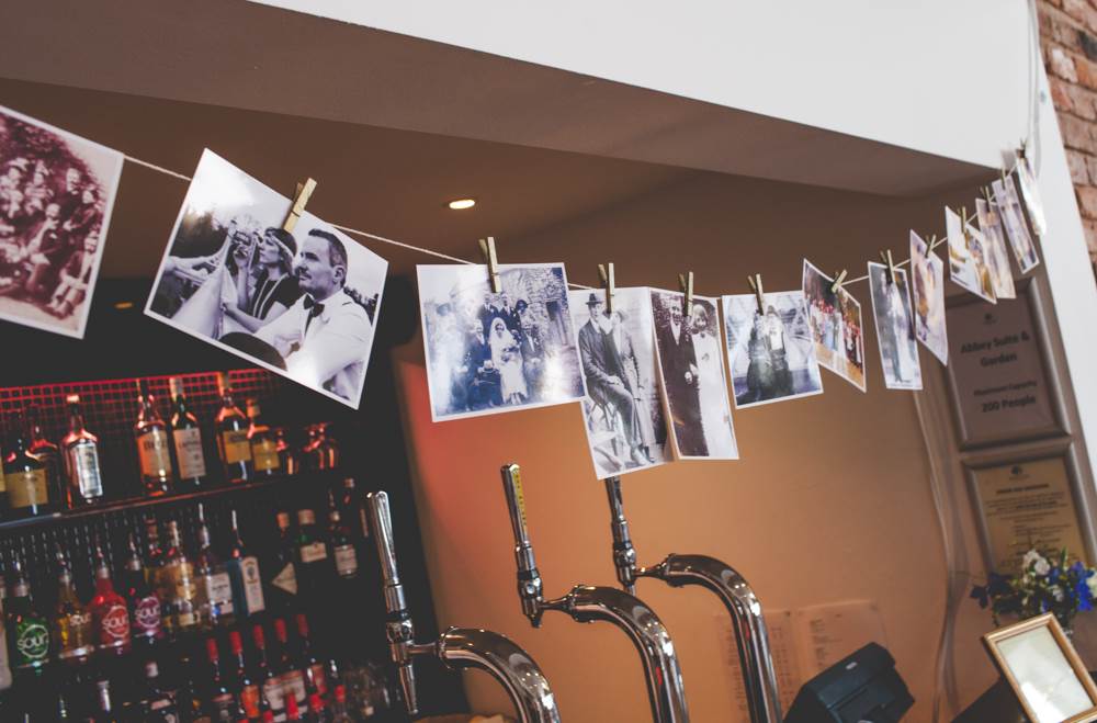 “I’ve always had a thing about the 1920s, the Charleston and art deco. I love how elegant, artistic and daft the era was, the women seemed to have a rebellious streak too which appeals! I like to think I’m all of the above! We had a 20s/silent movie theme running through from the invites to the placemats I designed (they included one-liners from our favourite comedians) and old picture frames with messages in them. We hung old weddings photographs of family members and friends families. The bridesmaid dresses and my own Enzoani dress were quite vintage/20s (which was quite accidental, I just happened to fall in love with a 1920s style dress!). The cake was based on a 20s vintage design. We also hired vintage props including vases, a suitcase for cards, beads and an easel for the table plan.”