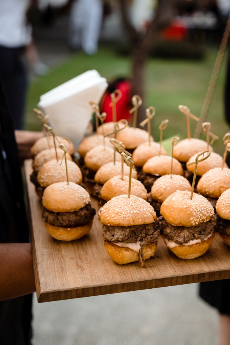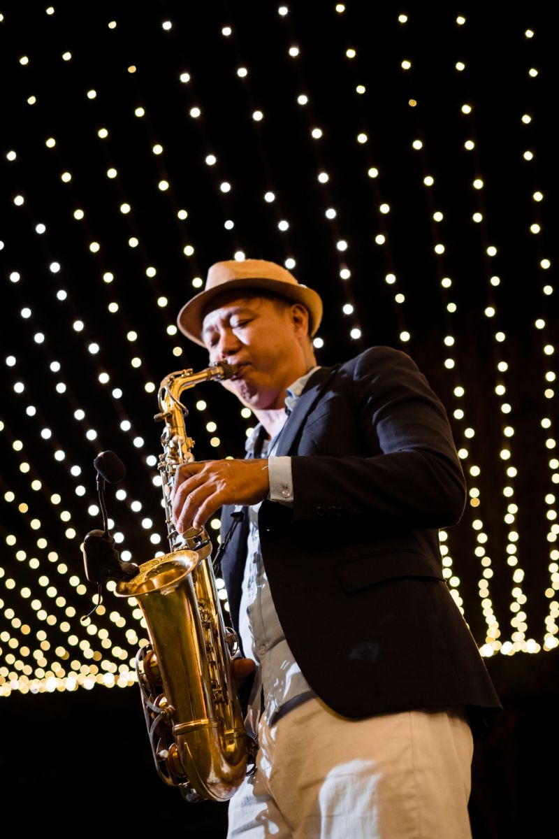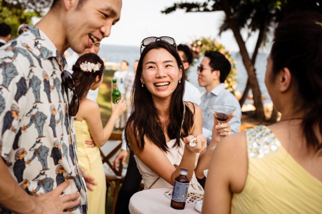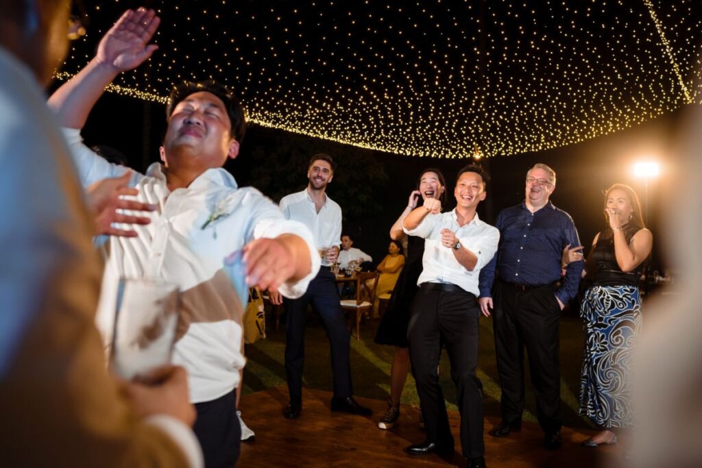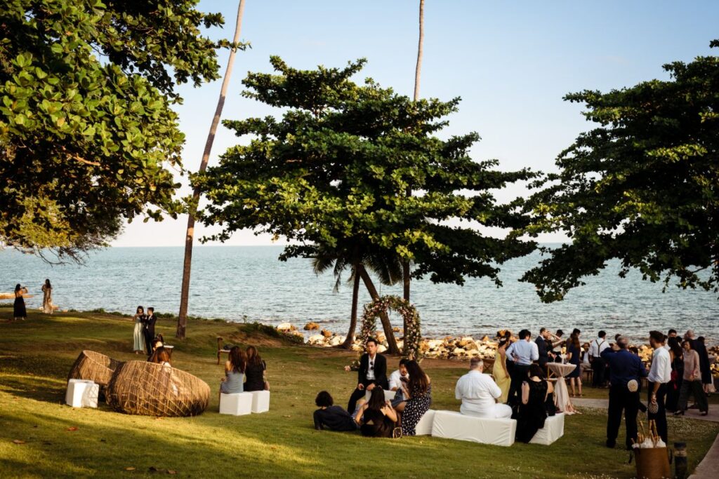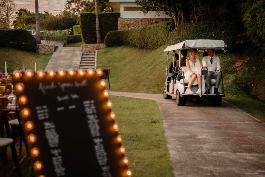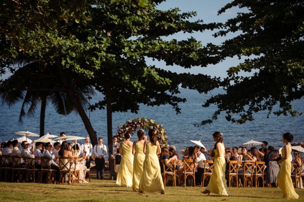 For the details of the day the couple worked hard to complement the backdrop and keep their guests comfortable including adding fans to seats to keep them cool “Dreamcatchers Events recommended the flowers and we tried to use more local Thai flowers to suit the tropical vibes but we skipped cake because the weather was too hot! “Our wedding planner worked with GoCatering who were very professional and high-quality and we visited Koh Samui for a menu tasting before the wedding date” Serving mini burgers and local cocktails is always going to go down well in our opinion! . For the entertainment they had a wide range of live artists “BabyFunk was our band, the female vocalist caught our attention and could play a wide range of songs. Jules played the saxophone during the ceremony and dinner. He was great as he walked around the dinner party and made eye contact with the guests.” And, for the special details there was a “champagne tower, fireworks, banana pancake cart for late night snacks.”