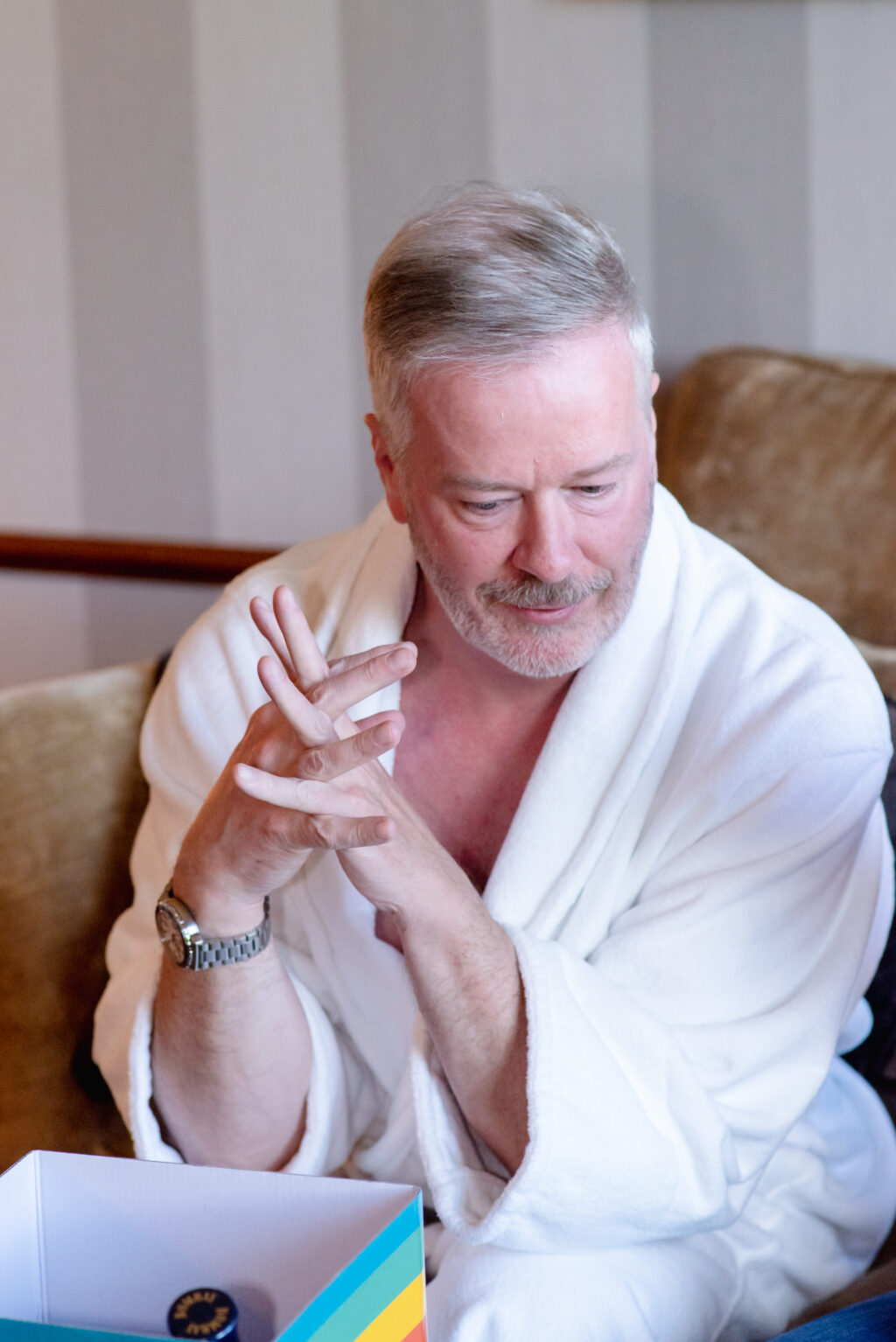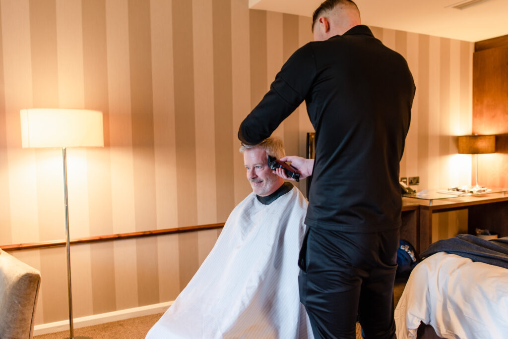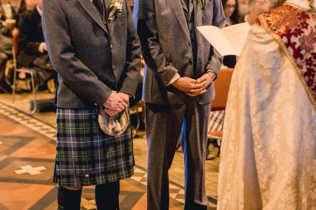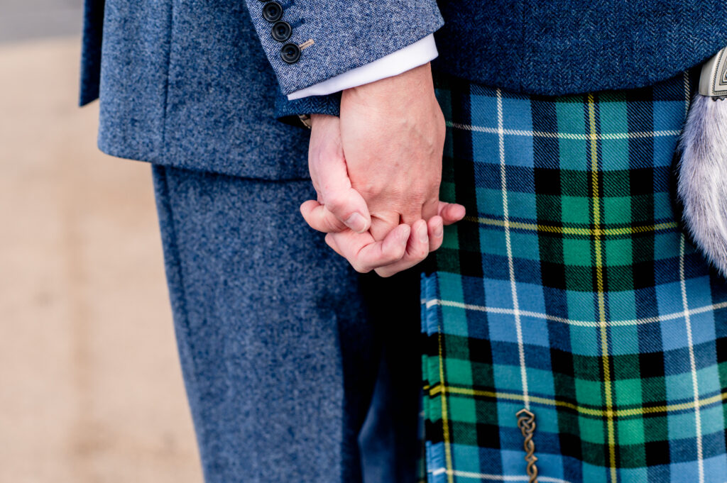 “I found the tailor King & Allen online as I saw they specialised in many same-sex marriages and I wanted to support them with my custom due to that. I had several fittings with Joe at the Liverpool Street branch where I chose a lightweight Donegal tweed in a mid-blue marl weave with a caramel lining and waistcoat back. I wanted something that I could wear both as a suit and separates for years to come. Shirts and ties for us both came from Hawkes & Curtis (we changed shirts for the evening dancing) and Chris wore his Kilt and Jacket. Shoes from Jones the Bootmaker.”