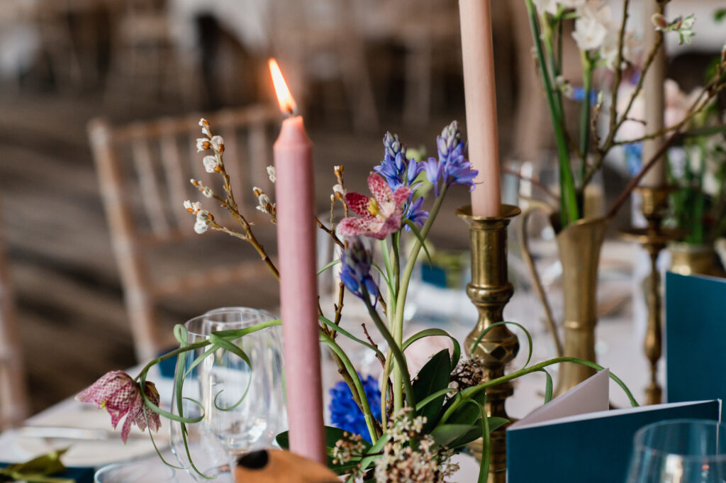 “Flowers from Wild Gorse Studio made 3 beautiful bouquets for the wedding party along with buttonholes and corsages for my mother, Chris’ Dad (and my friend’s little boy as a surprise). The cake by Cakes by Fiona was a semi-naked 3-tier sponge in cherry bakewell, raspberry and white chocolate and double chocolate complete with flower sprays provided by Wild Horse. Our invitations and stationery were designed by myself using templates bought online at Creative Market and were printed online.