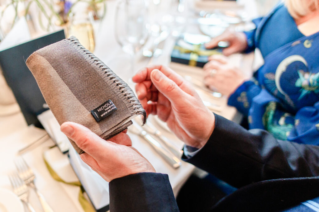 “The colour scheme came from Chris’ family tartan the Ancient MacNeill of Barra which is a beautiful strong blend of blues and green. The dresses for the rest of the wedding party were a blend of new and vintage but sourced to reflect the style of the wearer and be something they would wear again. We worked with the florist to create a looser, lighter contrast with the flowers in pale pinks and creams and lots of locally foraged greenery. This contrasted with the masculine colours of the tartan. As I am a professional handweaver, textiles were always going to play a strong part in the design.”