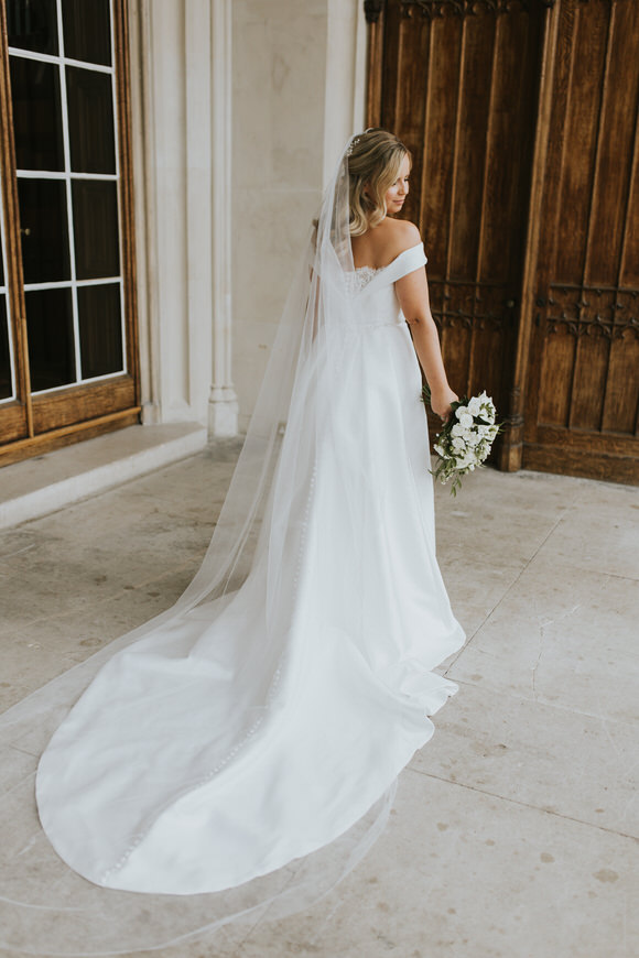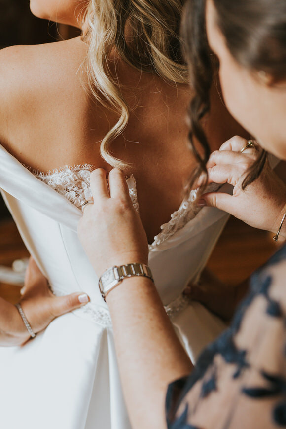 “Georgia wanted a handmade dress that captured her perfect vision of what she dreamed of. “The dress was a bespoke design by Lisa Lyons Bridal. A bardot style silk ziberline, fitted bodice with trumpet style skirt. Beaded lace back detail and a detachable full skirt with train and hand-beaded crystal waistband”