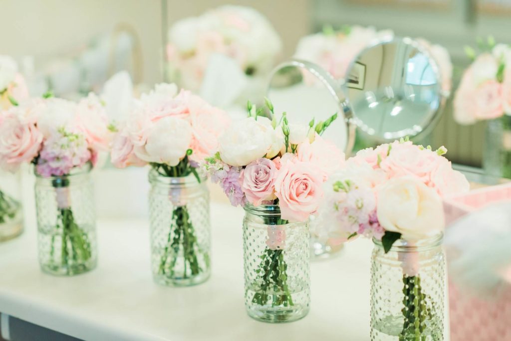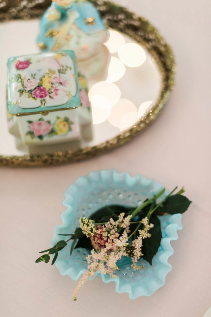 Each table had beautiful head vases as a centre piece along with other dressing table pieces and the table numbers were hand embroidered adding to this pastel wedding look. “I wanted to add colour to the guest tables, so I made fabric chargers with a lovely print of roses and polka dots. For any table standing alone, I used Fenton milk glass hobnail vases. I carried those details into the wedding cake.”