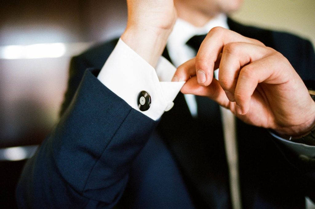 Tony wore a midnight blue tuxedo with black accents for a retro look. While the groomsmen wore a slim black tie, Tony wore a classic black bowtie. The vinyl record cufflinks also added a retro detail to the groom’s outfit.