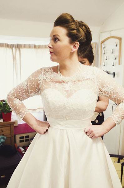 I sketched the dress I wanted as soon as Mike had proposed but I couldn’t find it anywhere. It was a kind of 50’s style, three quarter length ivory dress with lace three quarter length sleeves. I tried a couple of others on but they just weren’t right. I searched the internet and had my mom and three sisters doing the same and eventually three weeks before the wedding, I found it, it looked perfect. My sister measured every inch of me and sure enough the dress was made and arrived about a week before the wedding and I loved it. The boning was fabulous the skirt was beautiful the bodice was the perfect fit…but, the lace of the top and arms was really poor quality. I was gutted. My mom came to the rescue; we went to The Fancy Silk shop by Birmingham markets and bought a beautiful piece of lace then she got in touch with a fabulous dress maker she had known years ago, Eileen. Eileen couldn’t quite believe how calm I was, not having a wedding dress less than 7 days before the big day, but she took the challenge on and amazingly altered the dress using the new lace in just a few days. Mom and I were over the moon and my perfect dress was complete.
