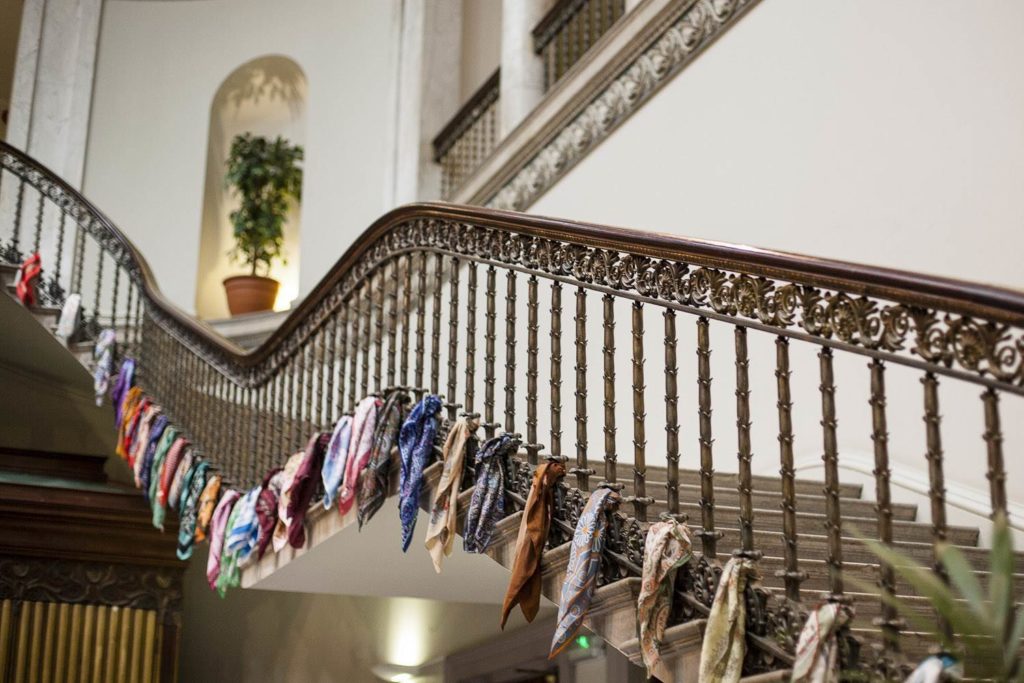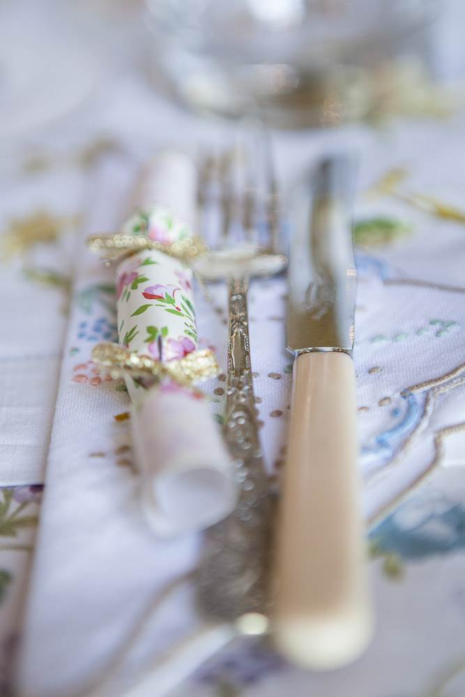 I tied bunting in the room we had afternoon tea in, I used old vintage scarves to decorate the staircase and made big tablecloths out of old floral king-sized duvet covers to cover the tables. I also collected lots of vintage embroidered table cloths that went on the tables along with old sweet tins. We used large sweet jars that we filled with sweets from the 1940’s as table name place markers and each person had to look for their sweet to see what table they were sat on.