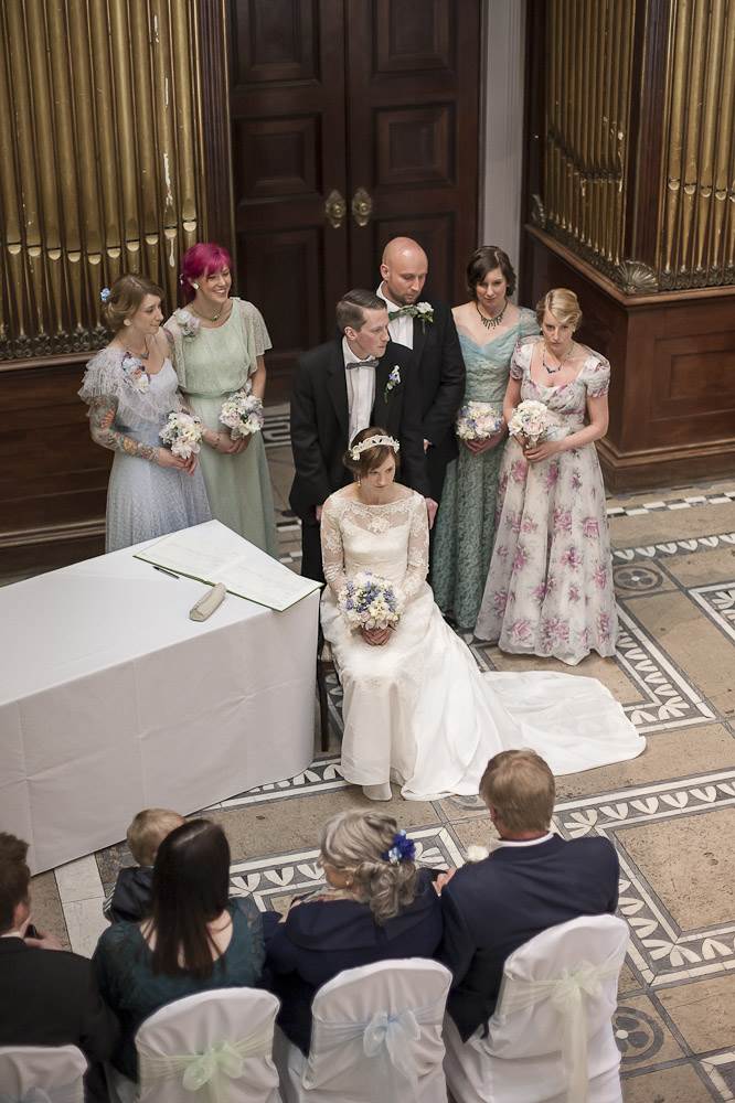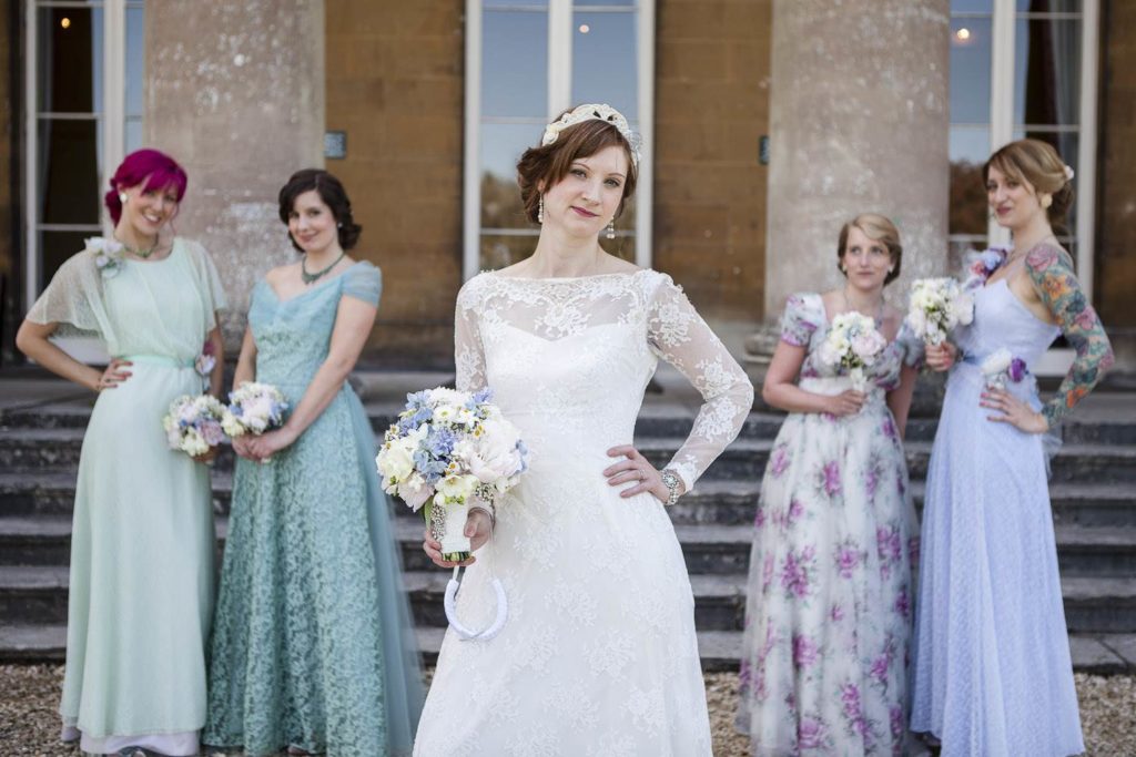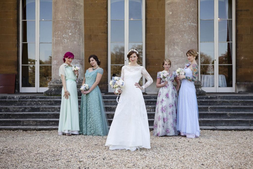 All the bridesmaids dresses were original vintage dating from the 1930′s to the 1940′s which I had altered along with my wedding dress by Susan Gilby. I also handmade all the hair accessories from scraps of ribbon and lace. The addition of handmade flower corsages tied the bridesmaids together seamlessly. Matching coloured vintage costume jewellery was sourced for each of the bridesmaids which was presented as gifts in dainty hand-made handbags.