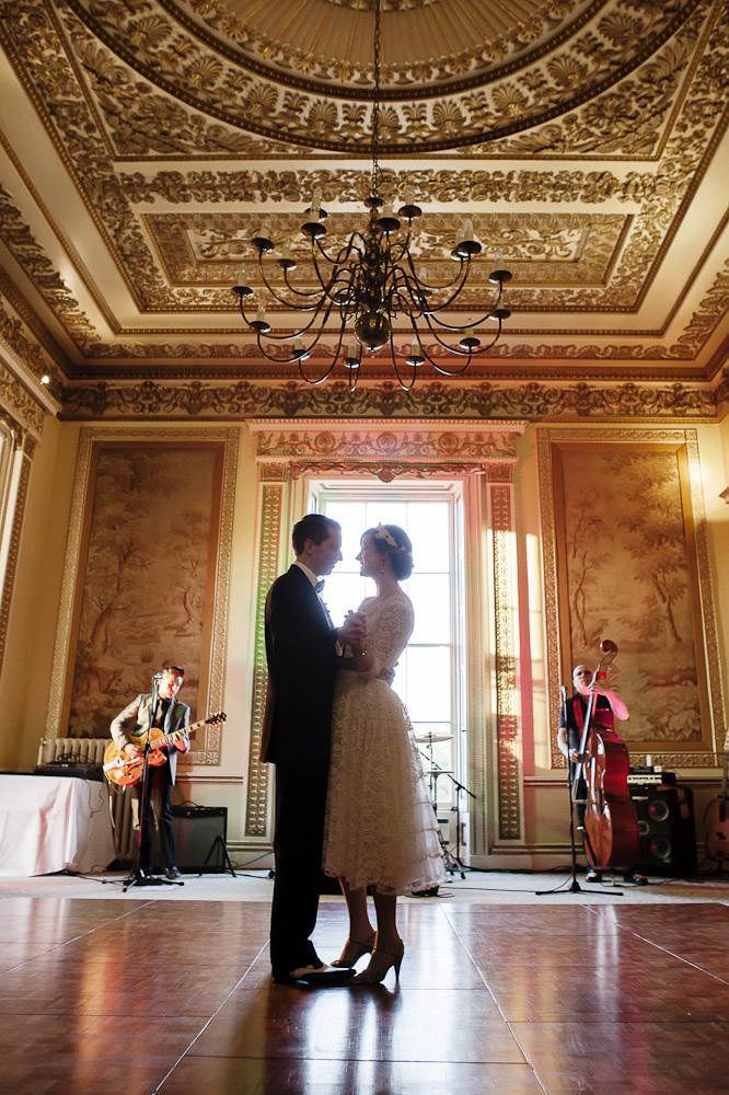 Thanks to the Vintage China Hire, the dining room had been transformed using delicate vintage teacups, mismatched with ornate teapots, floral doilies and china cake stands. It was the intricate details and personal touches which really made the difference – female guests were gifted with hand knitted cupcakes for scenting drawers, whilst the male guests were treated to personalised handkerchiefs. Miniature crackers provided an icebreaker around the tables and wild pastel toned seasonal flowers were scattered in glass vases. High tea was served with miniature sandwiches and fresh cream cakes whilst a Rockabilly band set up in the adjoining room.