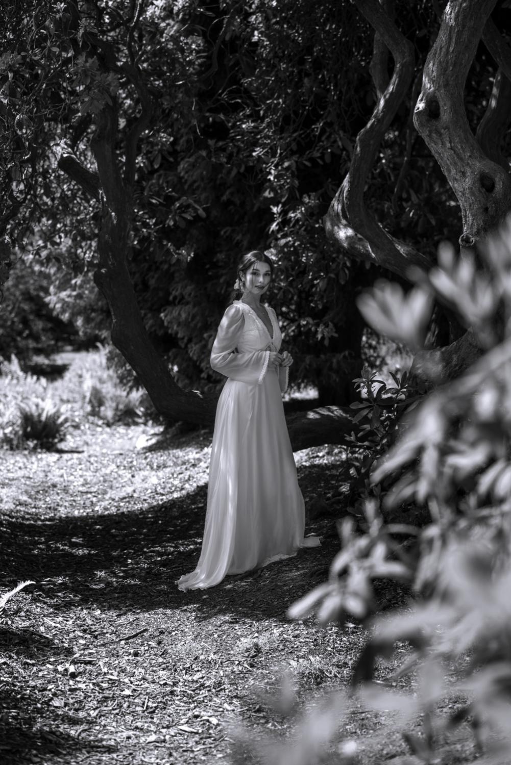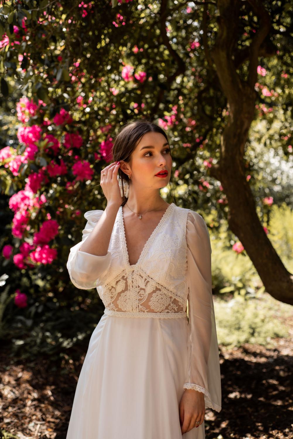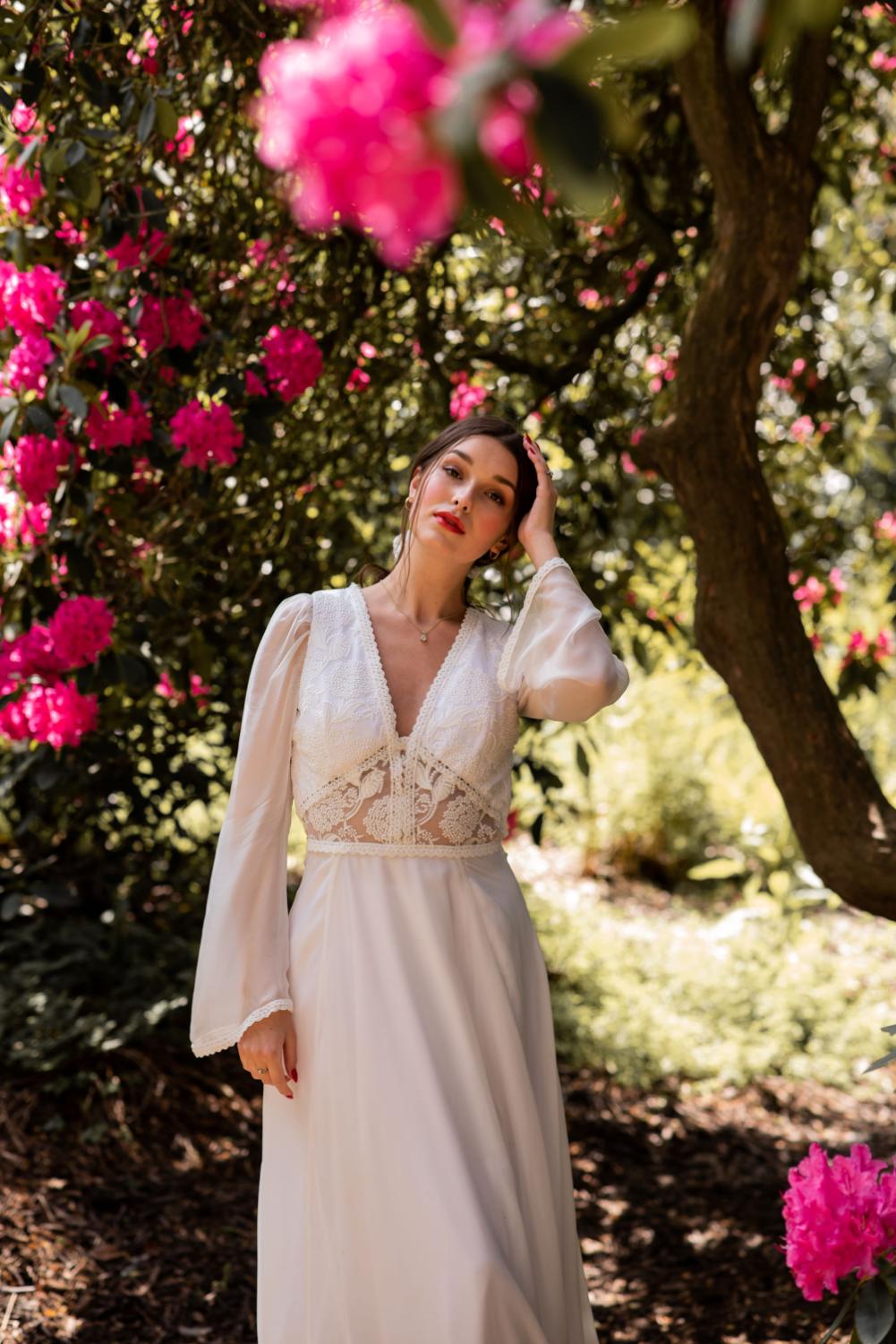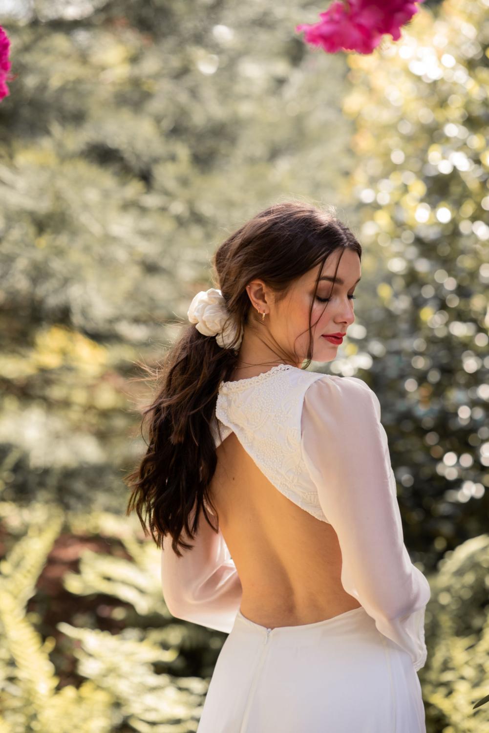 They share, “Immersed in Spring, this modern boho look is fresh, feminine and minimal with touches of texture and movement bringing in those edgy boho details that we all love. With spring in full force, blossoms and bright pink rhododendrons fill the scene, with the ivory wedding dress contrasting against tree trunks and the floral space. The dress is made from peace silk; a silk which is not harmful to silkworms and the lace was in tune with the natural textures that surrounds our bride. Jessica Turner Designs wanted to create a flowing, boho look, with the wide flared sleeves and a striking backless design, so our bride’s modern wavy hair look could be seen cascading down her back. Keeping the skin minimal whilst radiant, Rachael added pops of berry to complement the complexion and kept the vibes organic and undone, by creating a loose S wave in the hair which created a raw textured finish. We wanted this shoot to embody natural feminine beauty with a carefree, whimsical feel.”