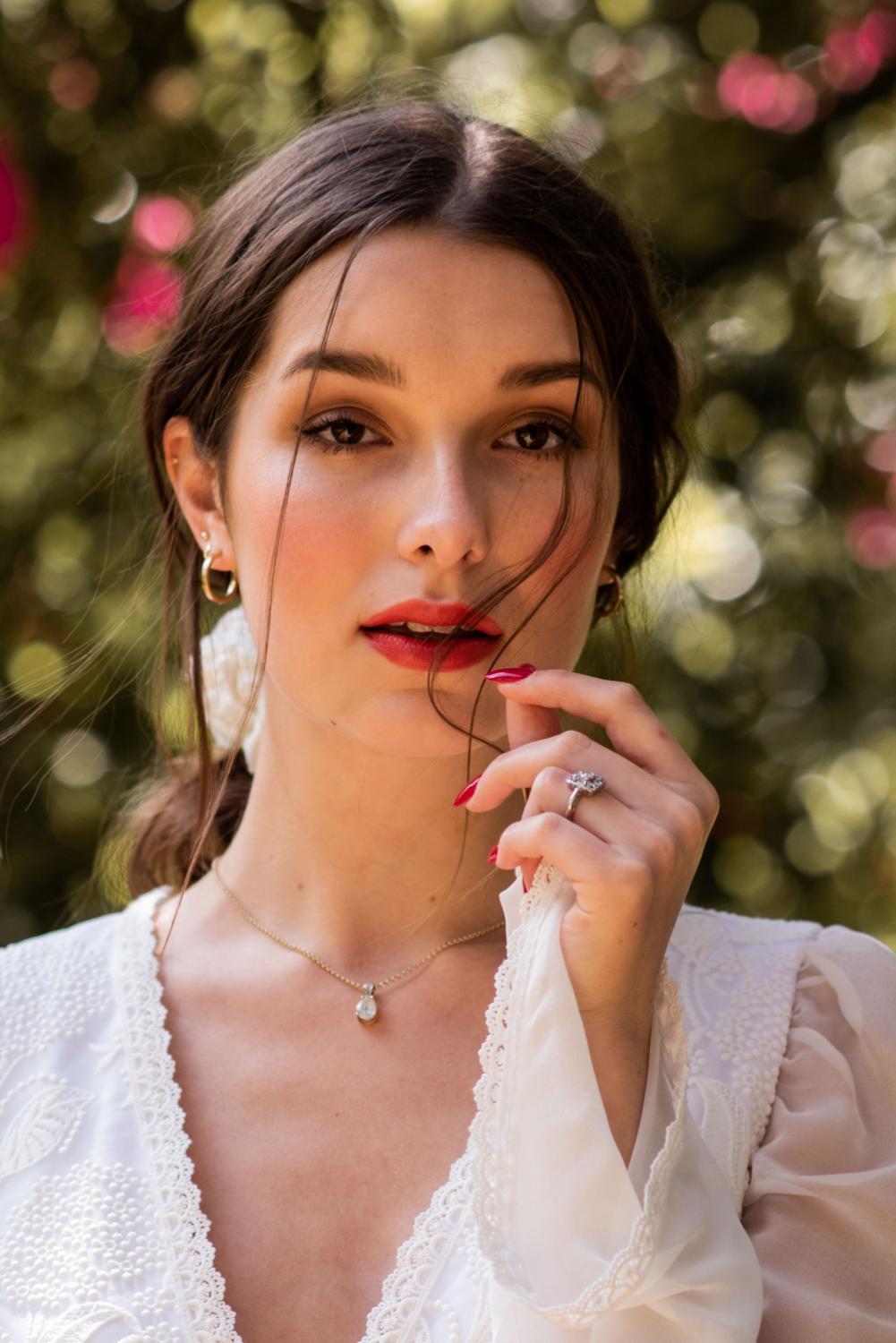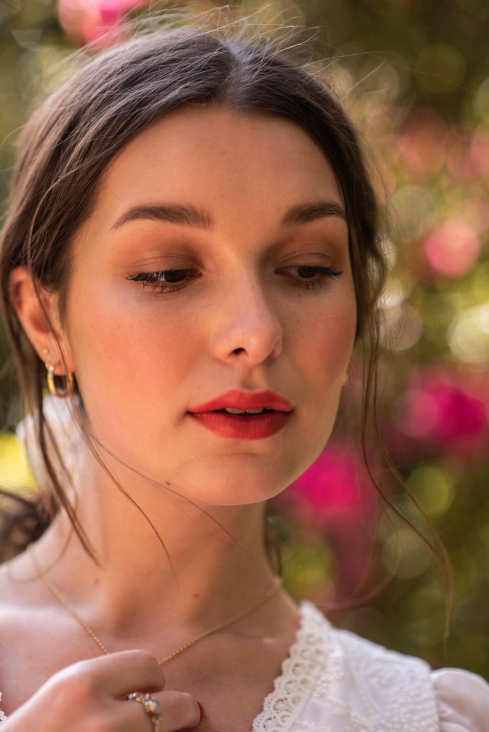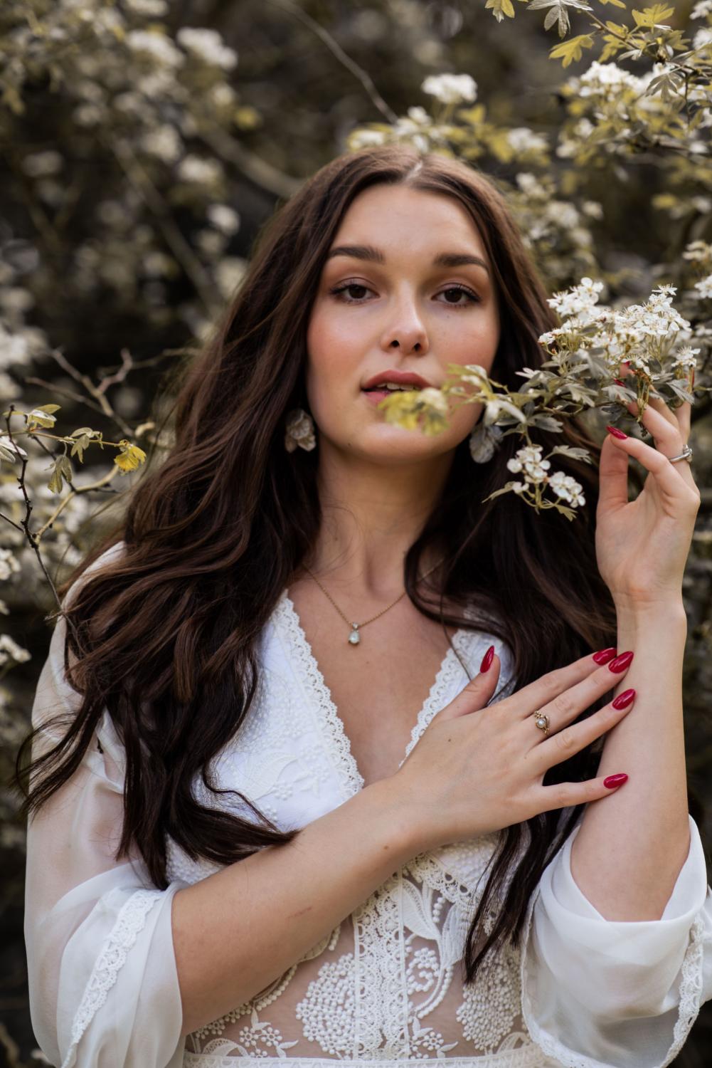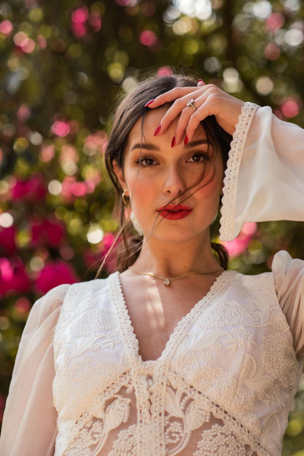 They share, “Immersed in Spring, this modern boho look is fresh, feminine and minimal with touches of texture and movement bringing in those edgy boho details that we all love. With spring in full force, blossoms and bright pink rhododendrons fill the scene, with the ivory wedding dress contrasting against tree trunks and the floral space. The dress is made from peace silk; a silk which is not harmful to silkworms and the lace was in tune with the natural textures that surrounds our bride. Jessica Turner Designs wanted to create a flowing, boho look, with the wide flared sleeves and a striking backless design, so our bride’s modern wavy hair look could be seen cascading down her back. Keeping the skin minimal whilst radiant, Rachael added pops of berry to complement the complexion and kept the vibes organic and undone, by creating a loose S wave in the hair which created a raw textured finish. We wanted this shoot to embody natural feminine beauty with a carefree, whimsical feel.”