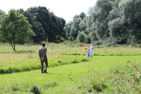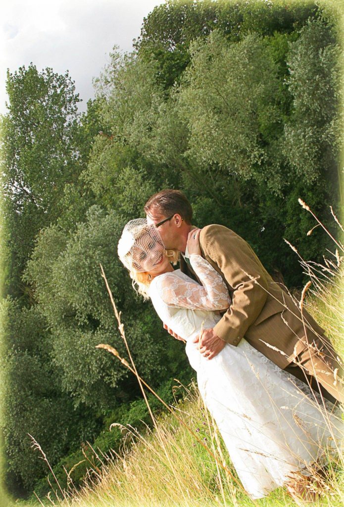 The August wedding took place at the beautiful Bromham Mill in Bedfordshire. The ceremony itself was a humanist service conducted in middle of a pretty meadow at the point where the Bedford River meets Stagsden Brook.  A lovely touch as before they met Adam lived in Stagsden, and Kate from Bedford.  Kate says I’ve been married before and had the huge wedding, so this time wanted a personal, intimate day all about us and our values.   A DIY approach was chosen so we could add our personal touches without spending a fortune…”.
