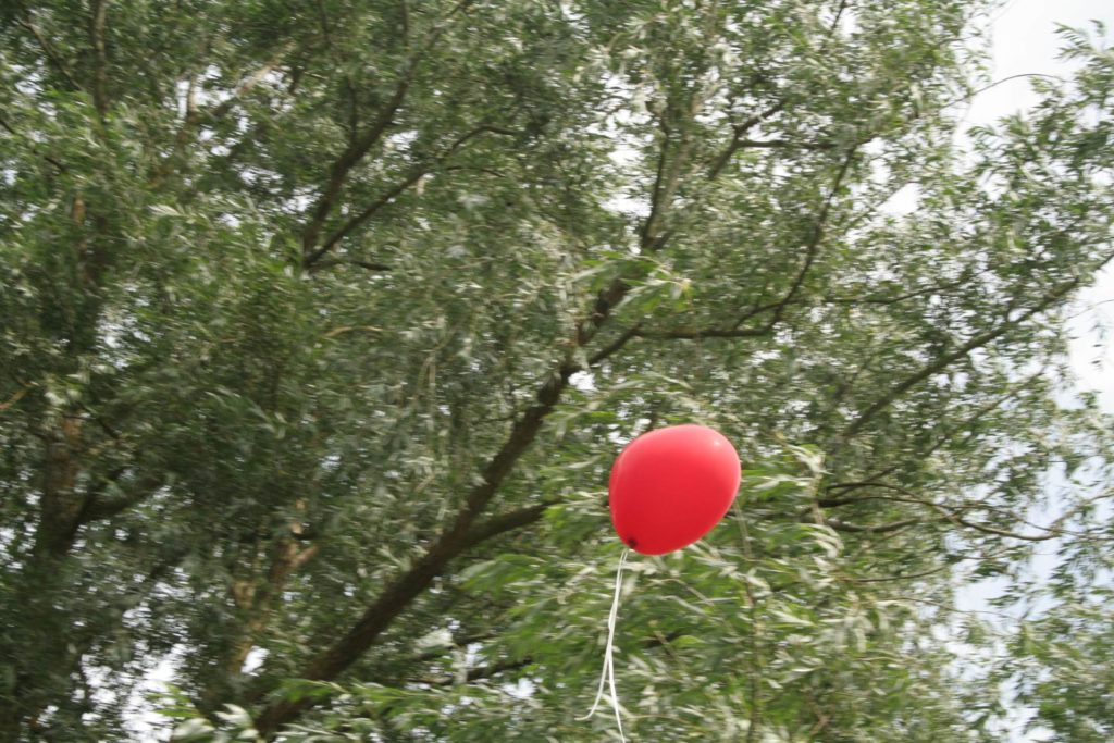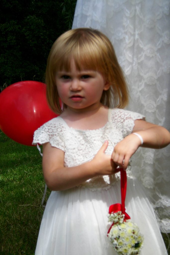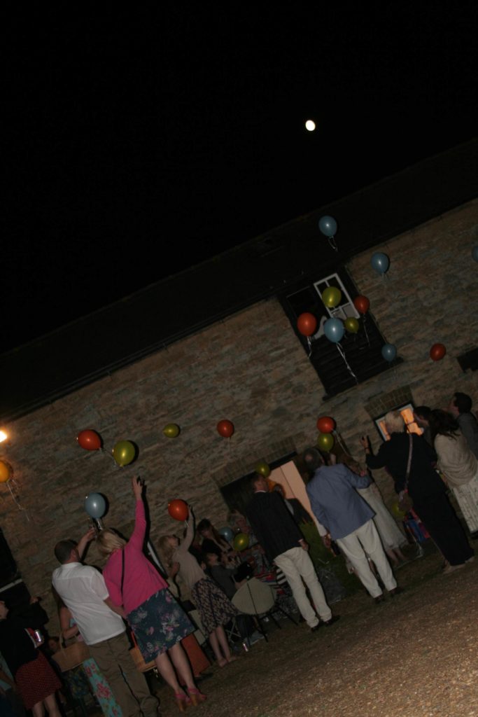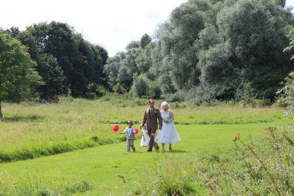 Kate arrived in a vintage VW camper van with her and Adams children Herbie and Kitty and walked down to the meadow where Adam met them.  Kate says “We wanted to arrive at the ceremony as us, as a family…together…”  Herbie and Kitty held red balloons when they walked in, and let them off during service.