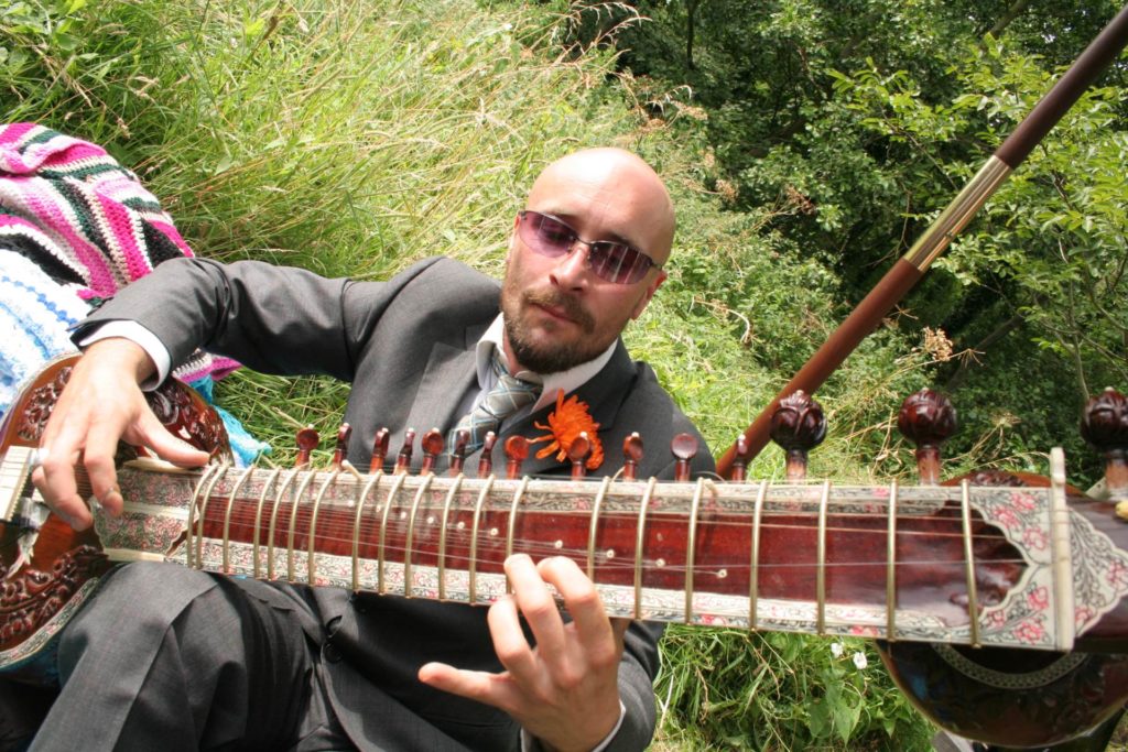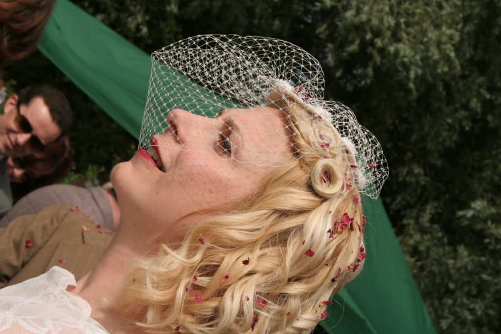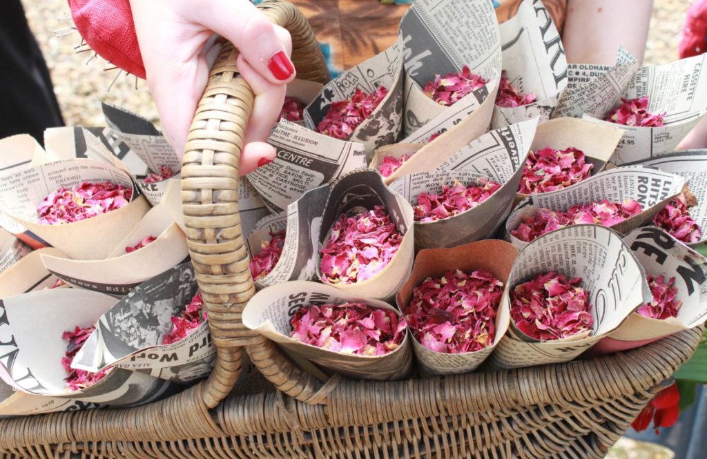 That year it rained all summer and Kate spent most of lead-up panicking about all the guest having to wear wellies!  On the day itself there was torrential rain that morning, but thankfully bright sunshine appeared (and stayed) for the ceremonies start at 2pm.  Friends played a huge part in adding special touches to the day – Adams best friend played sitar, Kates friends helped out wearing 1950s dresses, handing out handpicked flowers on arrival and confetti of rose petals wrapped in cones of vintage newspaper.