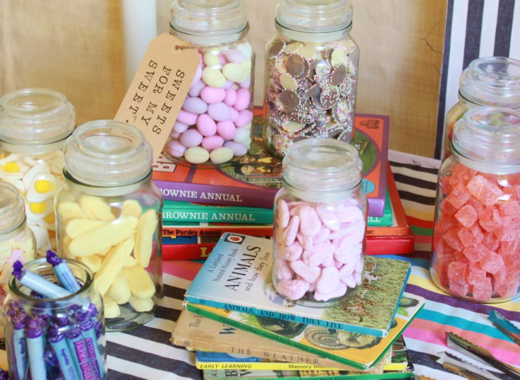 Kate sent out picnic baskets to her guests the month before the wedding with a note saying to fill them with goodies and after the ceremony as the band ‘Swing Ninjas’ from Brighton played, guest ate their picnics sitting on benches, rugs and deckchairs both outside and inside the venue.  Kate says “We didn’t want a seating plan, we wanted our friends to catch up in a relaxed environment while having fun”  Everyone brought cakes for the cake table, there was jars of retro sweets, a raffle and quiz and Champagne was drunk in tea cups.  Kate says ” We wanted it to feel like a fun village fete with a raffle, quiz and coconut shy, and a colour theme of stripes, with retro games on the tables”
