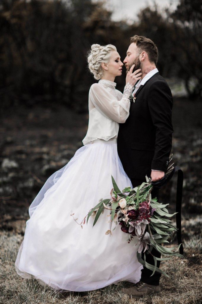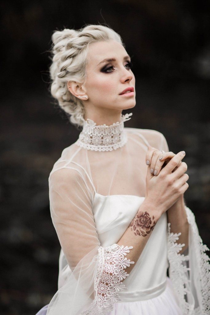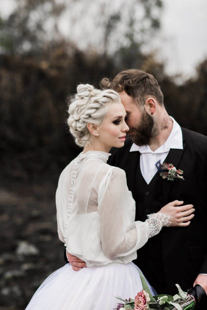 Domini’s makeup was created by the very talented Kerry of Blue Vanilla Beauty. As soon as Kerry saw the fabulous dresses and painted leather jacket, she knew the make-up had to be somewhere between grungy rock chick and pretty modern bride. Kerry created a strong smokey eye using MAC carbon black eyeshadow and Mac blacktrack eyeliner, Lancôme Miracle Teint foundation over Niod photography fluid gave the skin a flawless glow and MAC peony petal blush for a fresh faced flush on Domini’s cheeks. A matte lip would have been too heavy for this look so she opted for a Kiko pink gloss to complement the cheeks and her icy blond hair. We wish more brides would be brave enough for a statement make-up look like this!