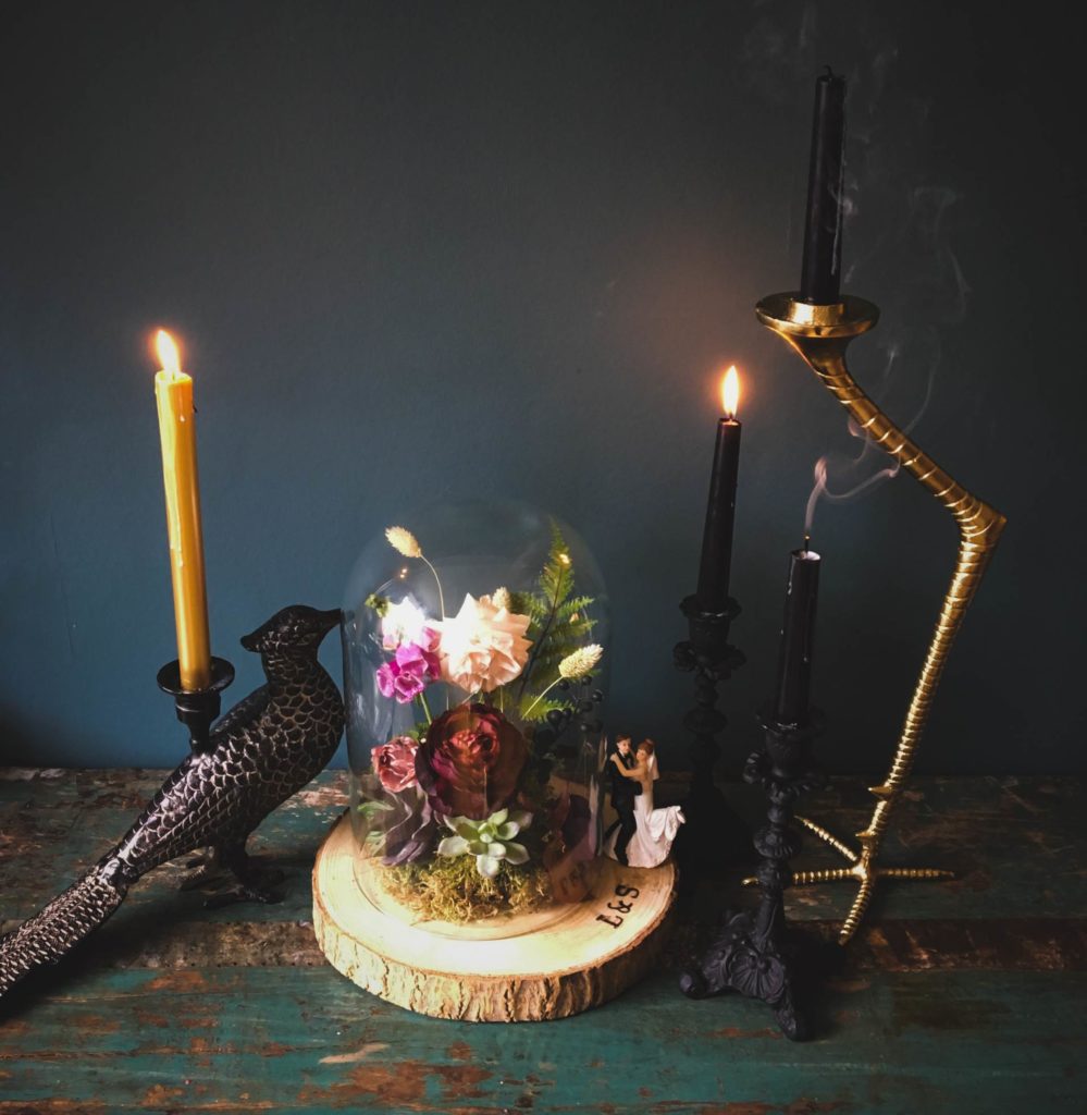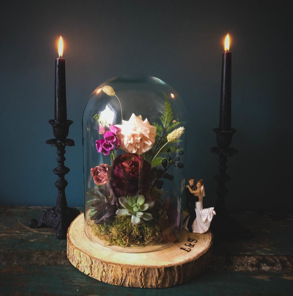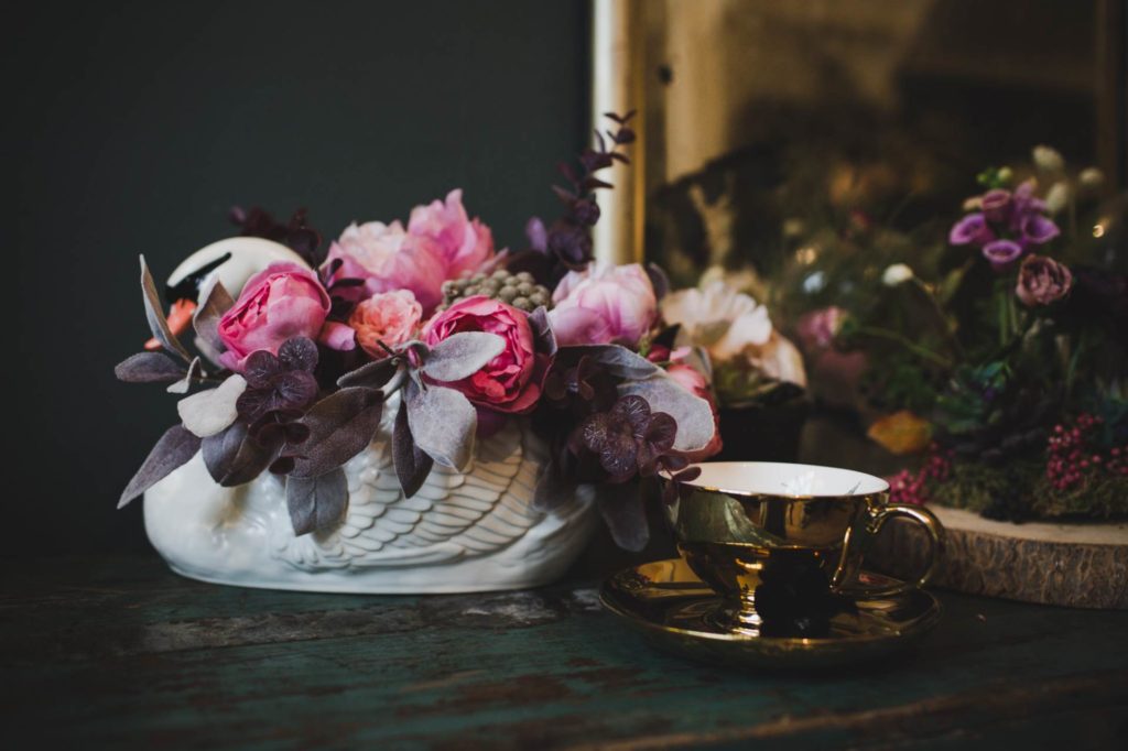 The bride’s bouquets and table flowers were designed by floral artist and stylist Cassandra King. Cassandra loves creating unique bouquets for original brides. Too often the bouquet can be an afterthought – and it is such an integral part of a whole brides look. All three bouquets were large loose and wild. Displaying the table flowers in quirky containers like the kitsch vintage swan vase stamp the look as really individual – and helps shake up some of the usual bridal flower traditions! Cassandra is also not averse to using faux florals within the styling and design; the personalised bell jar she created for instance uses artificial blooms. It means it is a visual part of the day the couple get to hang on to forever. Some of the artificial flowers out there now are gobsmackingly realistic. You really would just never know!
