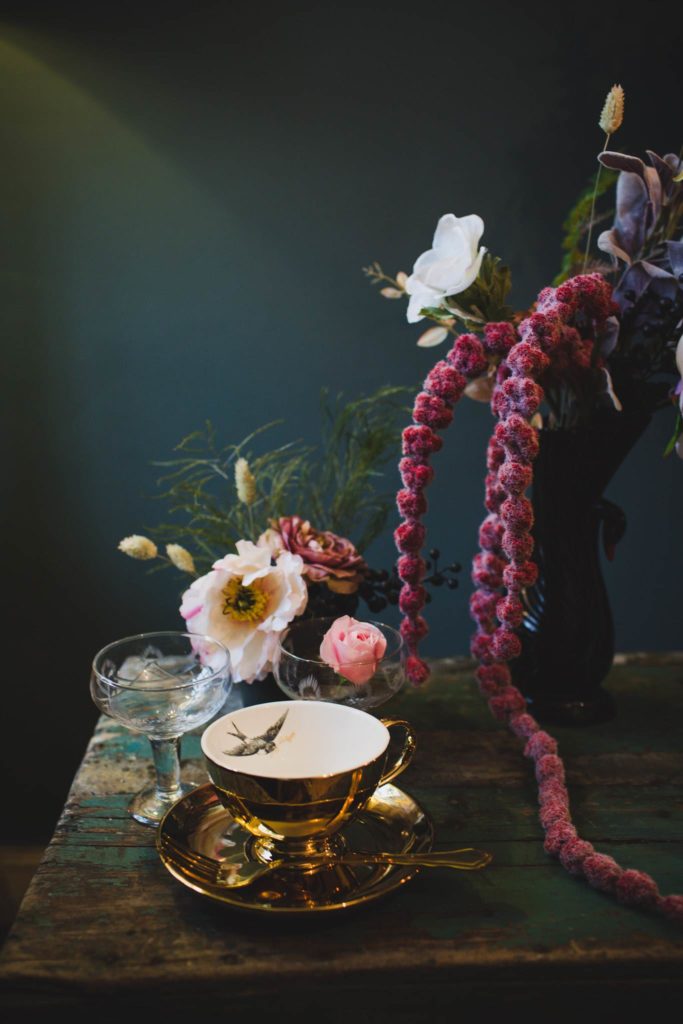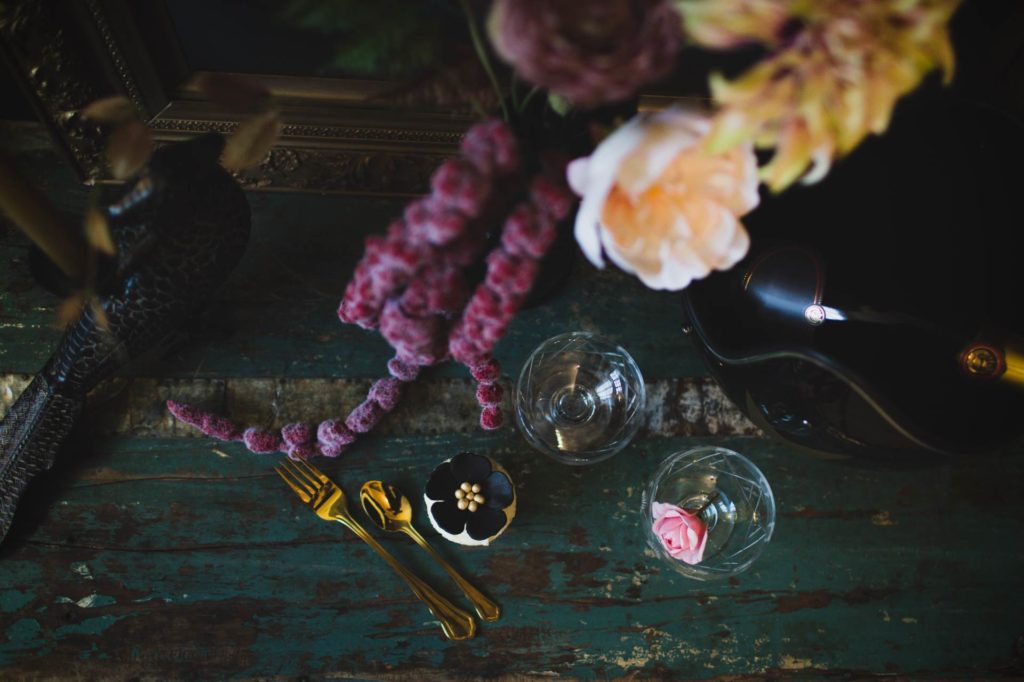 Cassandra suggested approaching eclectic homeware company Rockett St George for the tableware as she wanted to continue the whole look of the day as being one that was fearlessly stylish and unique; the general dark and expressive vibe bucking the usual white on white theme. Using lots of gold accents and pops of bright florals against dark and earthy backdrops created a magic and personal feel that ties in with the whole bride and groom’s personal style, right down to the fabulous bike helmet ice cooler working alongside that leather jacket