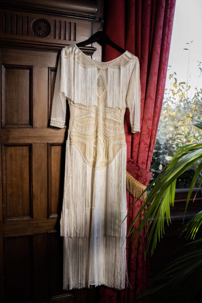 “We chose a classic ivory 1920’s-style beaded gown by Gatsby Lady, paired with