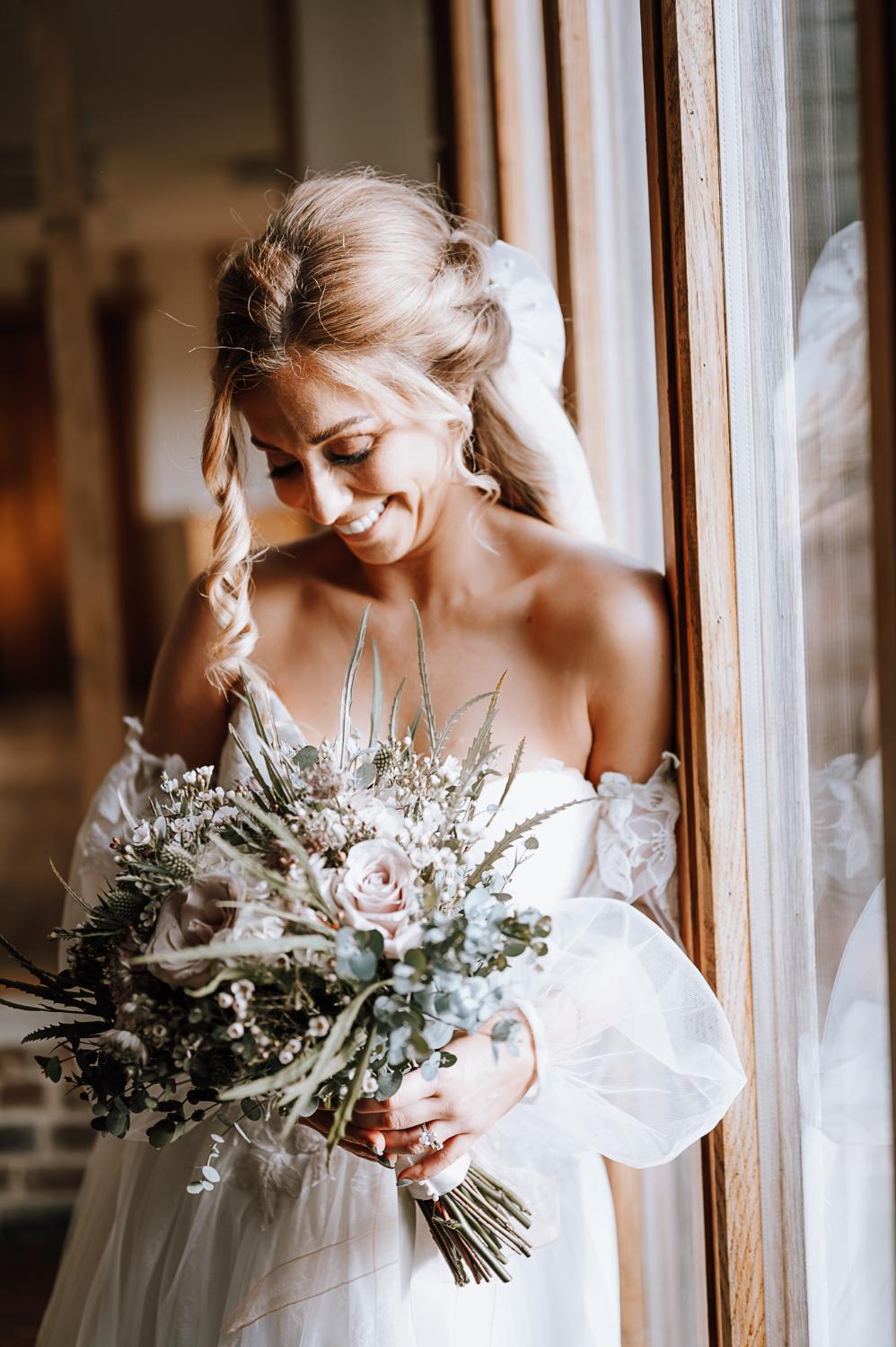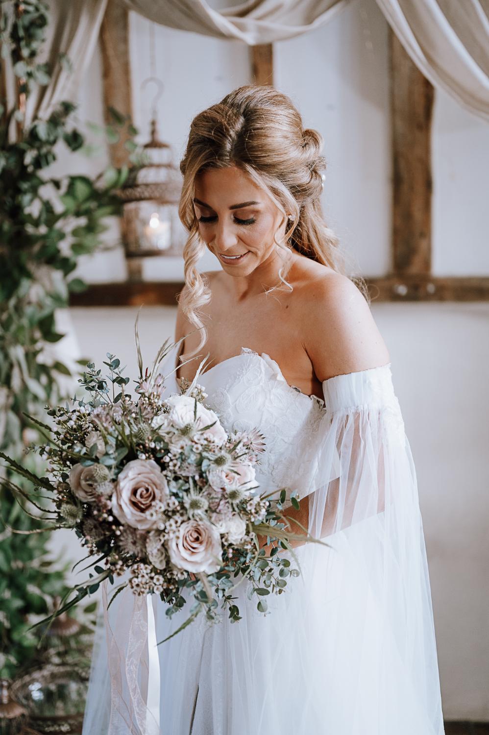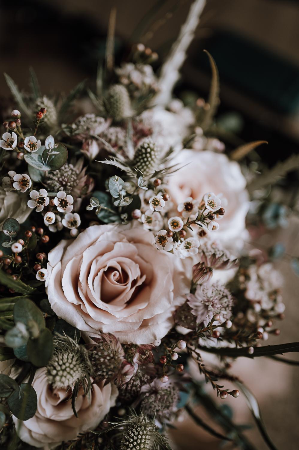 “Choose a florist who you connect with and whose style you like, have a look at their Instagram or website and look at reviews from previous brides to see their feedback. I have a meeting and get to know my client as well as really getting a good indication of what they are looking for, generally starting with the bridesmaid’s dress colour and what colour suits and ties the guys are wearing. Then I put a colour palette together with that in mind, as everything needs to blend in beautifully. Most brides are happy to leave it up to me about flower choices unless there is something they particularly want included – I haven’t had a disappointed client yet! For this shoot I was left to a completely free reign so my bouquet centred round these lovely quicksand roses then I just look around and choose what I like to go with them. I love how this bouquet turned out.”