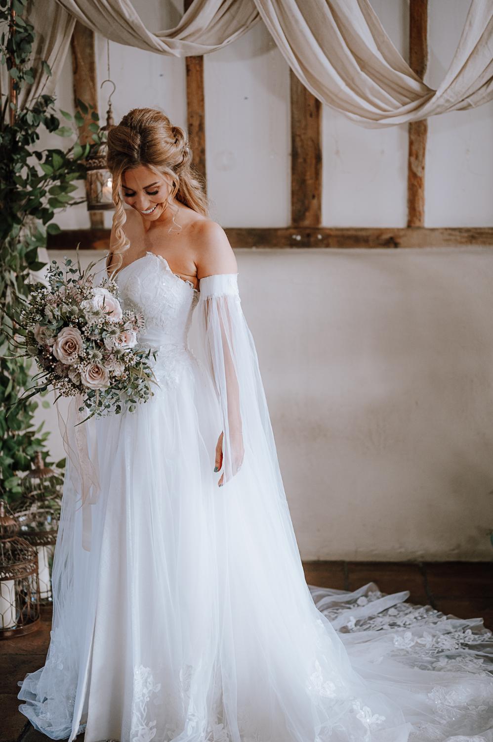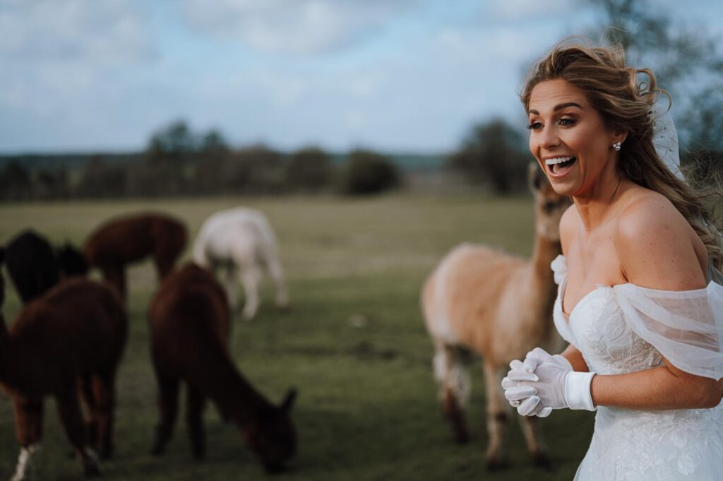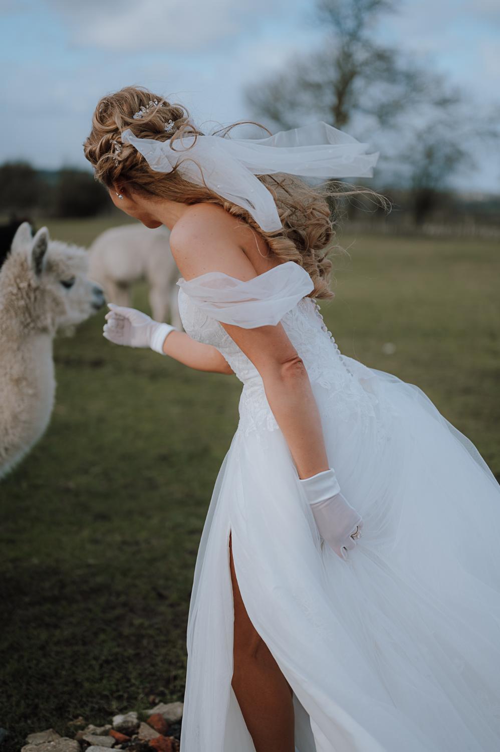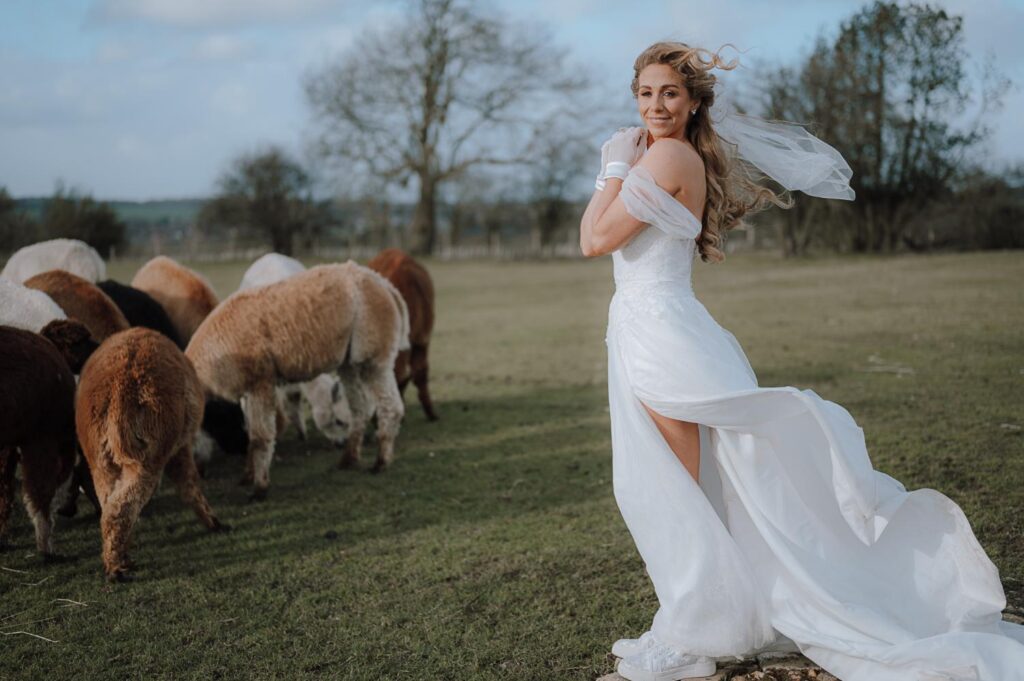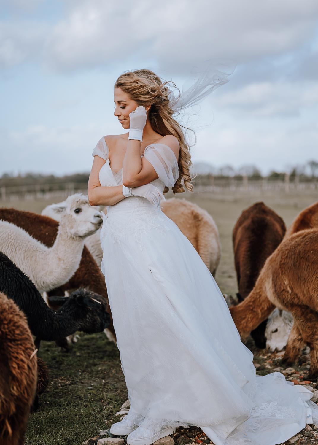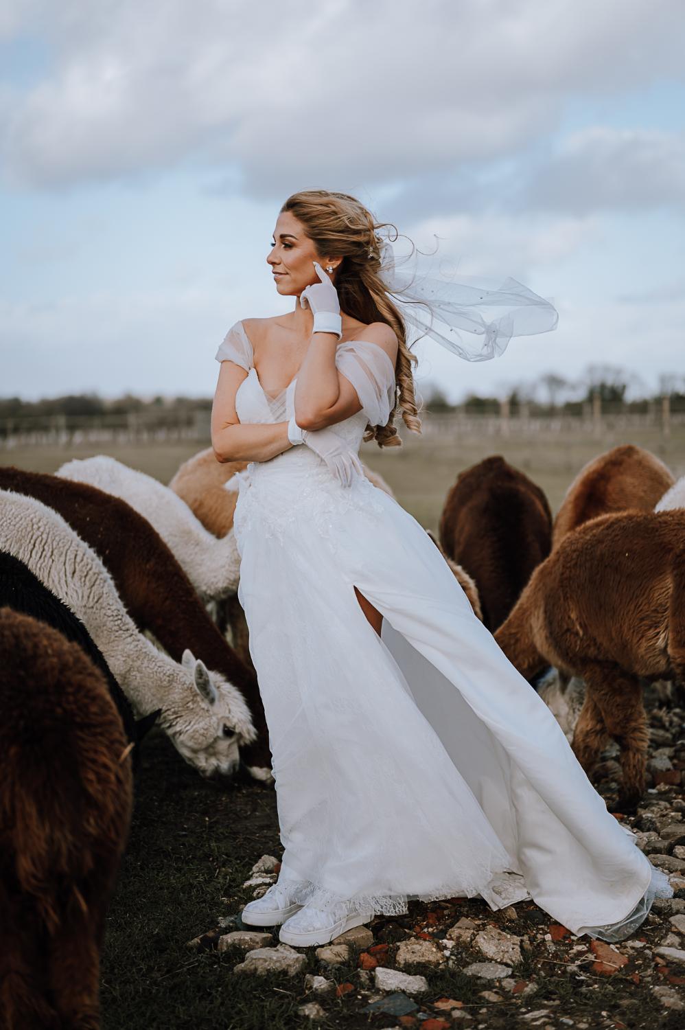 “We did this shoot for Kay Heeley’s launch of Alex’s bridal dress. We wanted to showcase the dress in different environments , as the dress itself is versatile. So we took it from elegance to alpaca farm. Couples can have a beautiful exclusive location wedding by incorporating fun shoots with animals as well as the bride changing up her look mid wedding!”