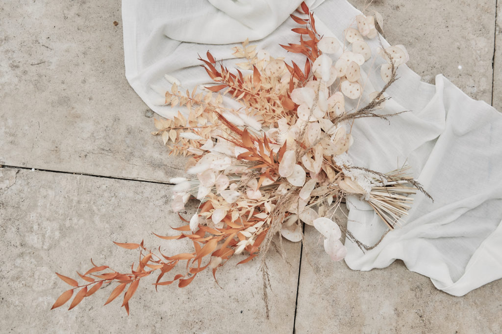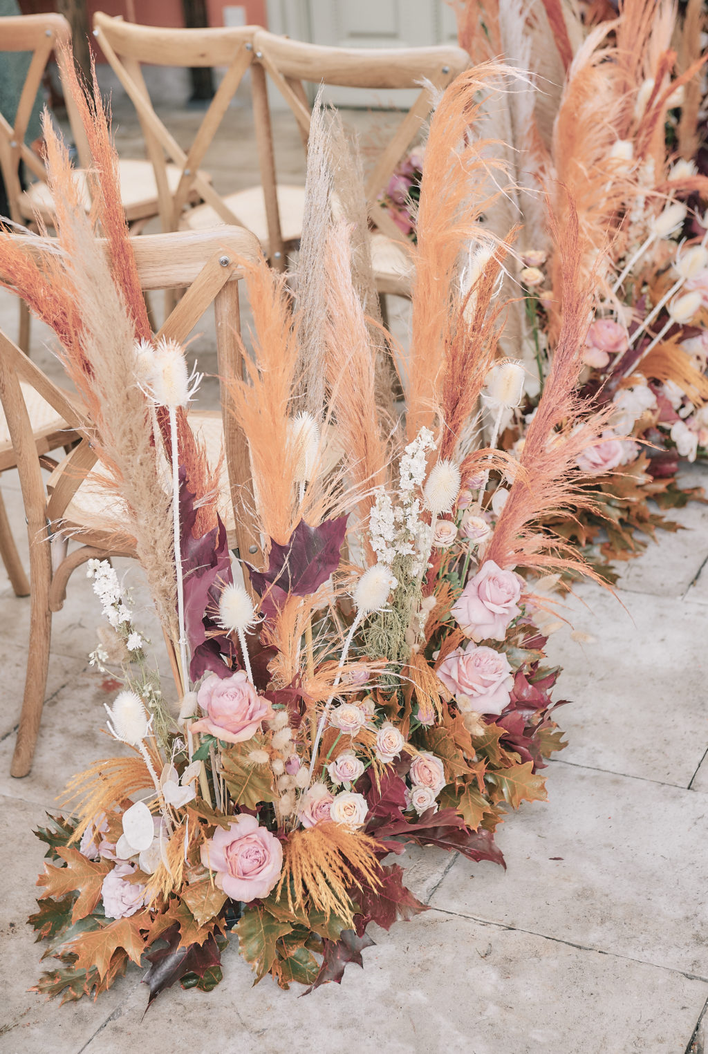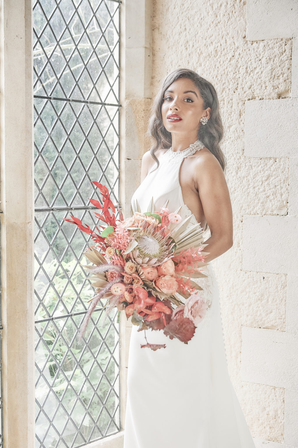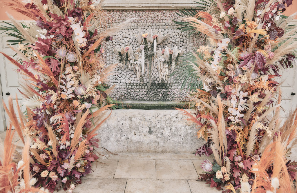 “Wanting to create a sustainable look we used a lot of dried flowers mixed with fresh, in the shades inspired by the venue which gave a beautiful whimsical, romantic yet modern look to the shoot. There is a real playful element to the designs with the colour palette and different textures but a sense of luxury too with the abundance of the designs and by adding in classic flowers such as roses, which also symbolise romance and love.”
