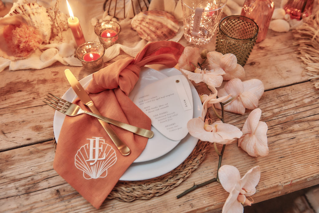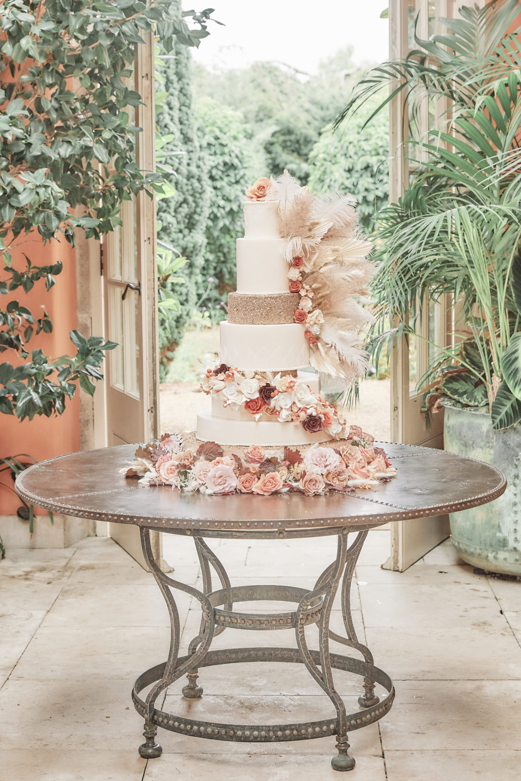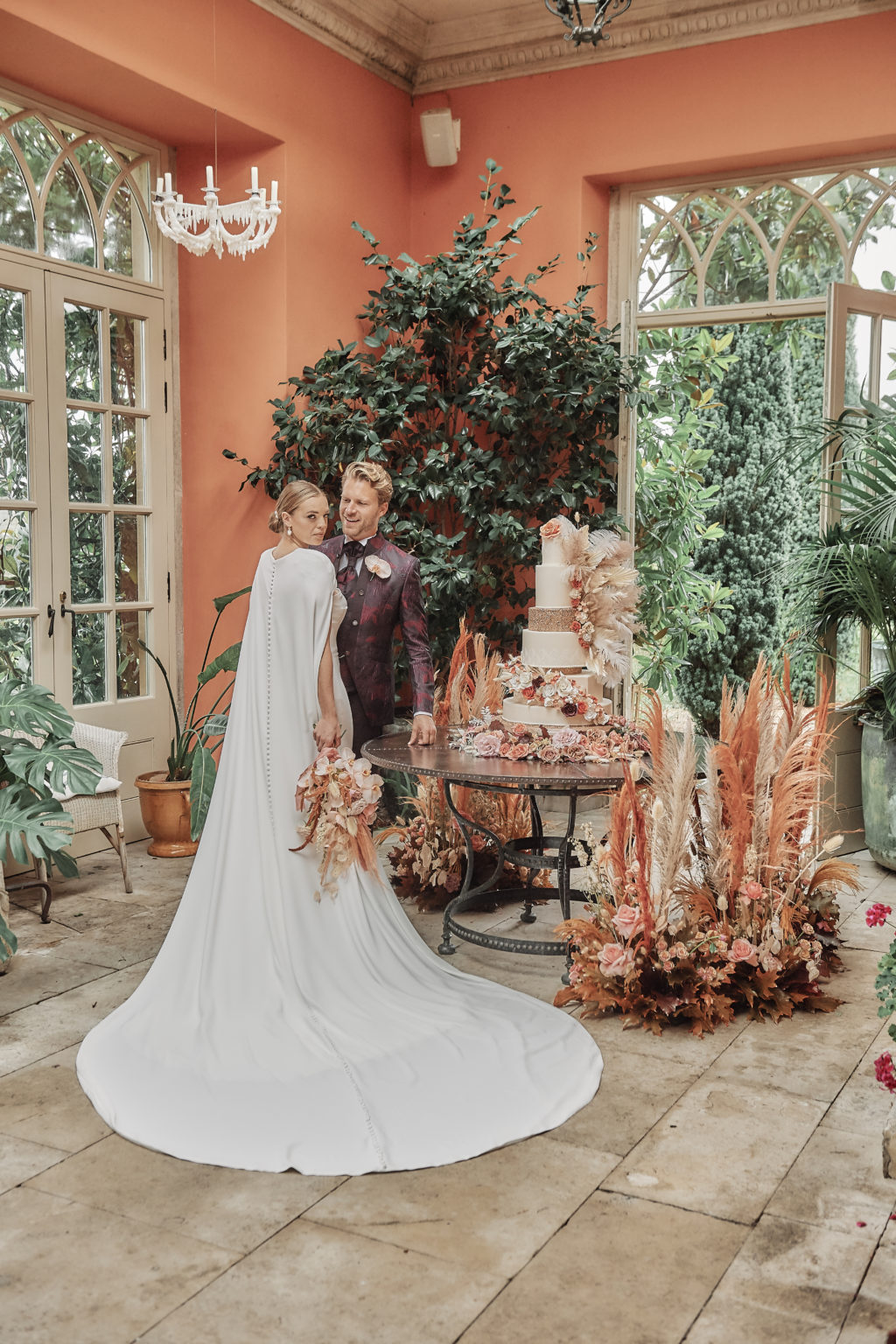 “The inspiration for this amazing shoot came from the incredible venue. We drew on the gorgeous tones and colours of the venue, especially the orange from the walls in the orangery and the pinks, corals and creams from the shells dotted all around.”