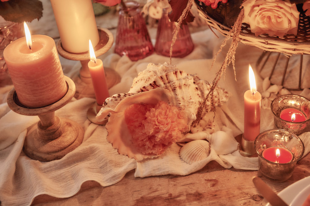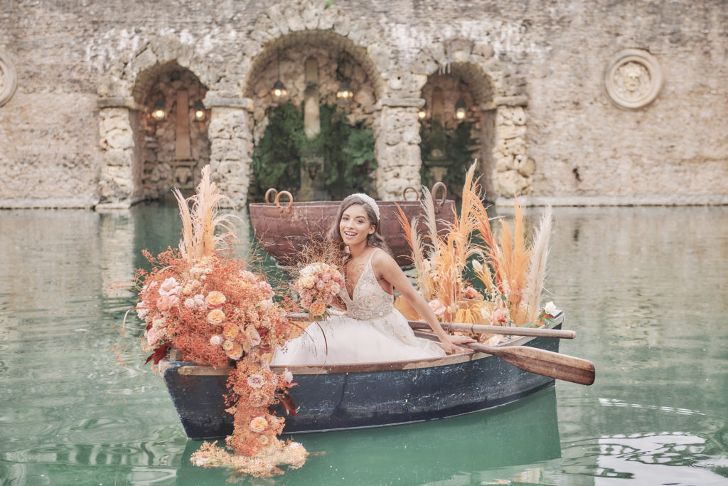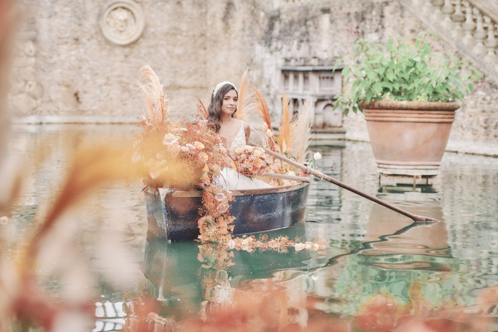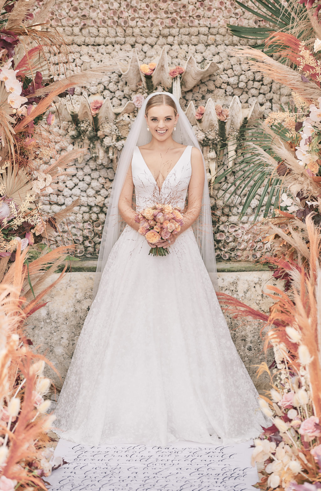 “The inspiration for this amazing shoot came from the incredible venue. We drew on the gorgeous tones and colours of the venue, especially the orange from the walls in the orangery and the pinks, corals and creams from the shells dotted all around.”