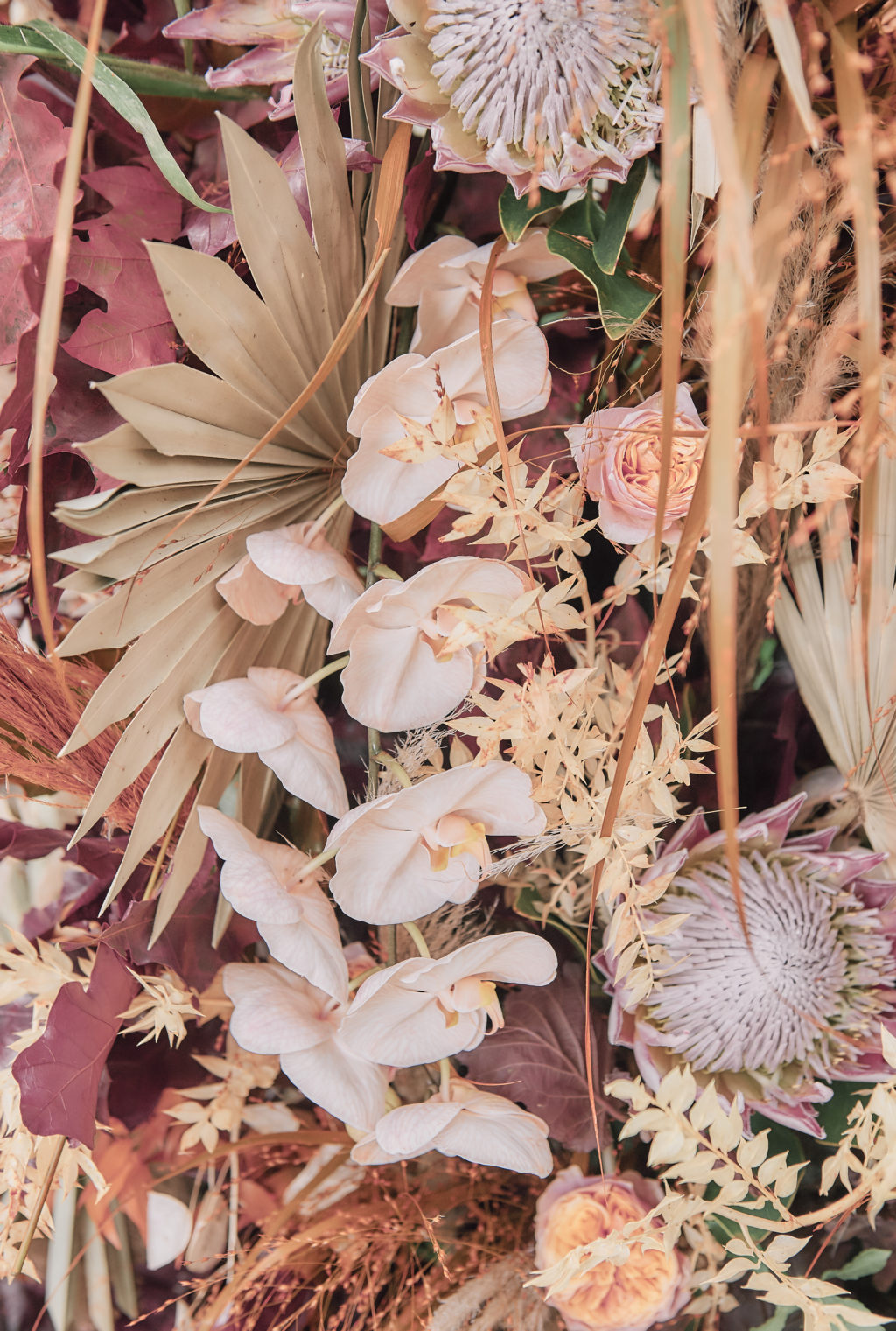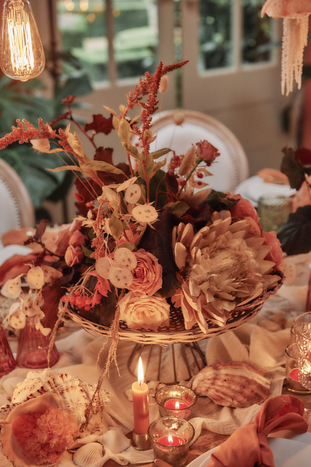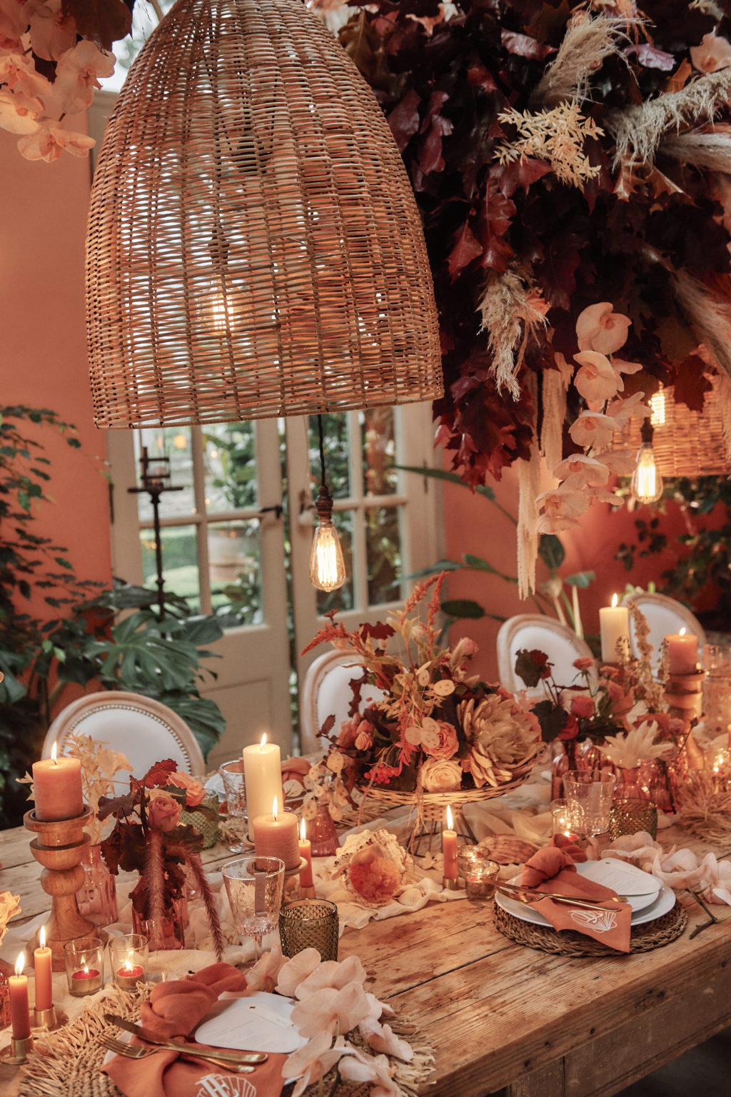 “We used a selection of dried flowers and foliage throughout the design and incorporated fresh flowers, including roses and orchids to keep a luxurious feel. You’ll see the focal point of the day was the incredible dinner setting with the floral structure running above the table, wicker lamps and the striking Edison bulbs to continue the warm feel.”