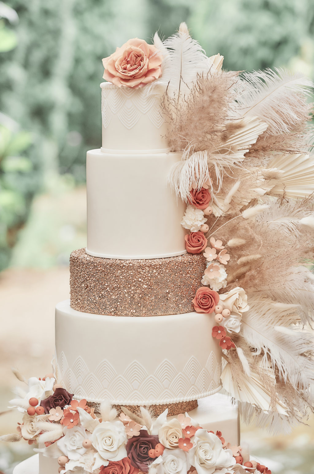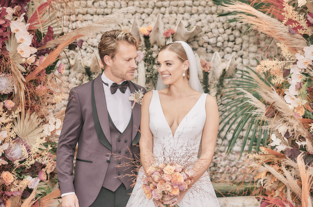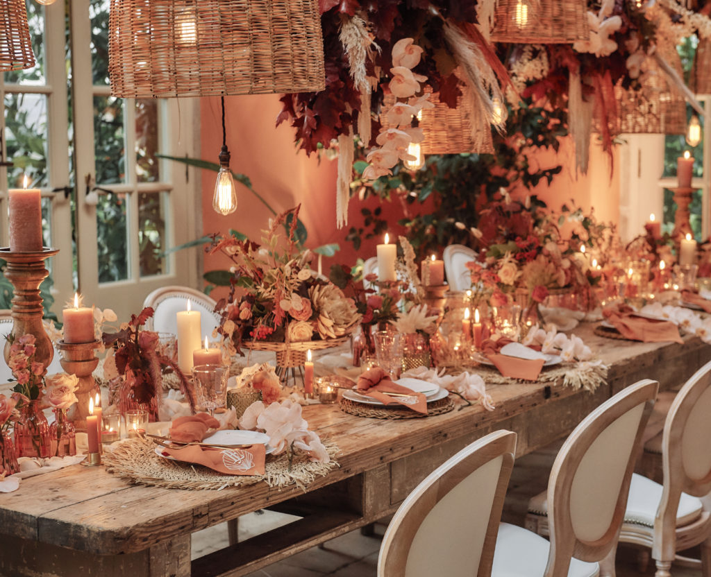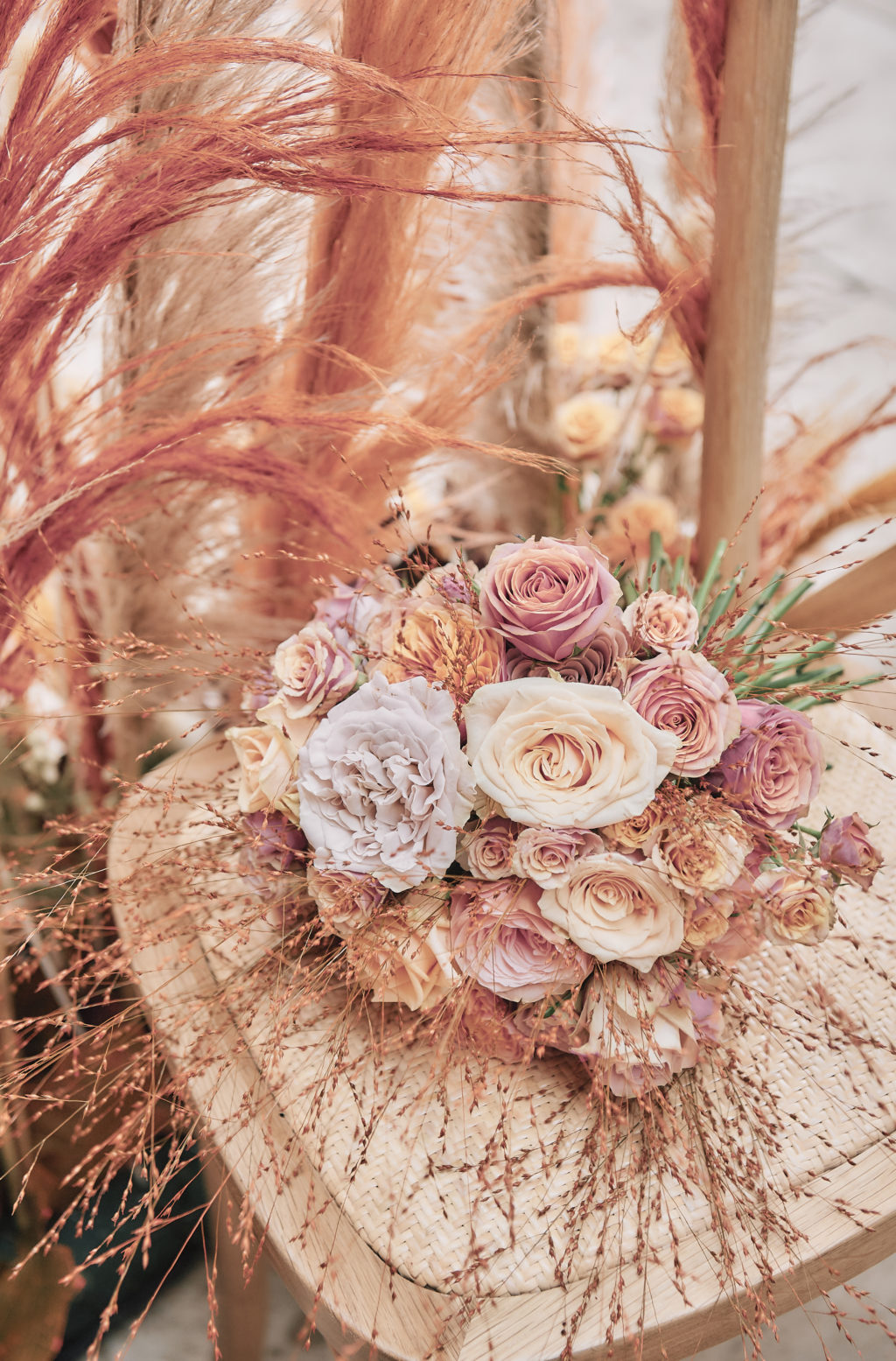 “We used a selection of dried flowers and foliage throughout the design and incorporated fresh flowers, including roses and orchids to keep a luxurious feel. You’ll see the focal point of the day was the incredible dinner setting with the floral structure running above the table, wicker lamps and the striking Edison bulbs to continue the warm feel.”