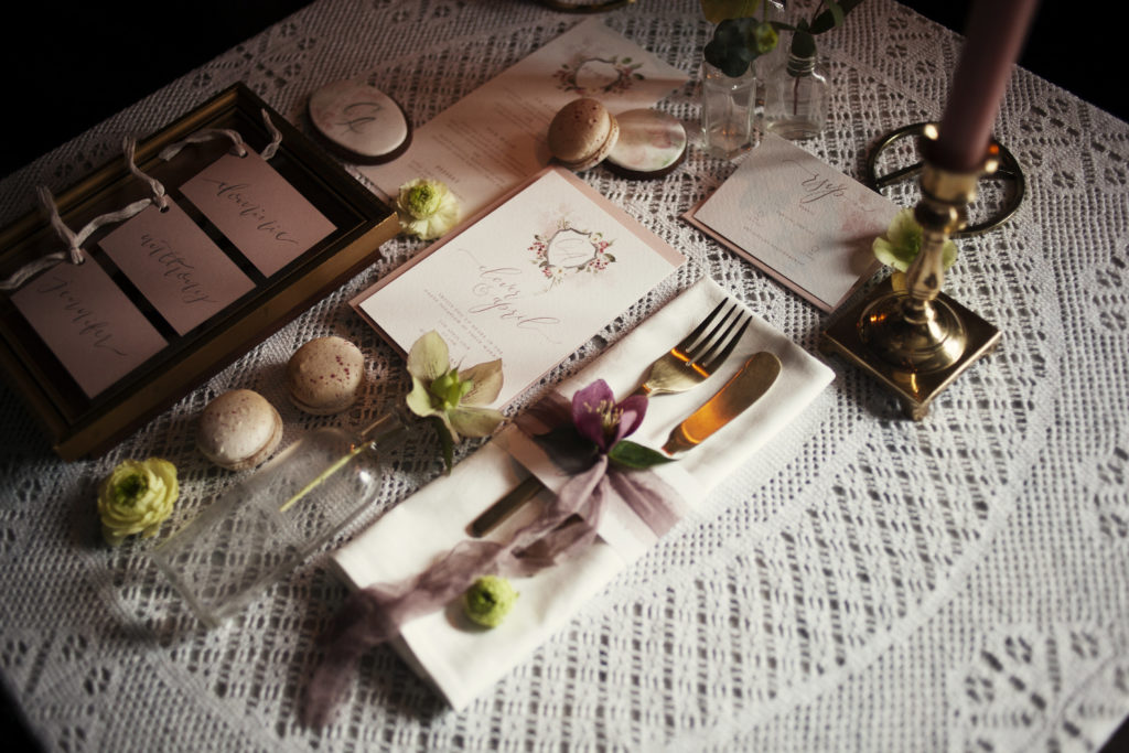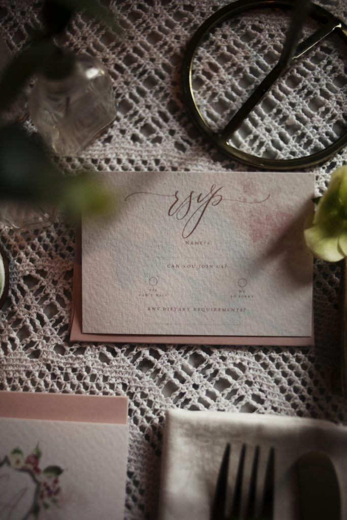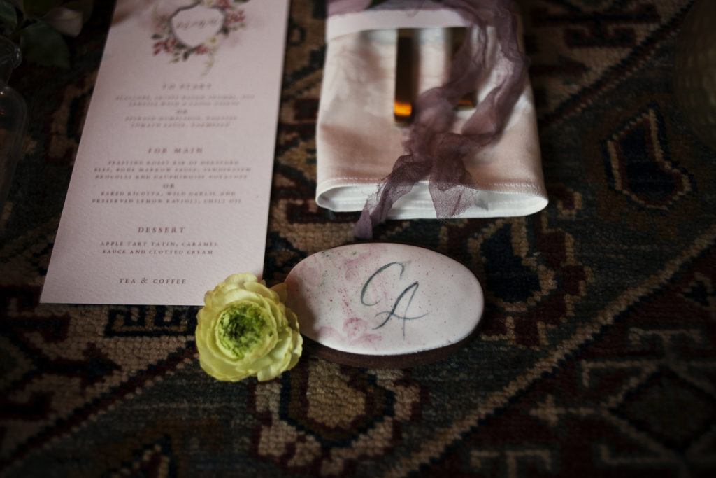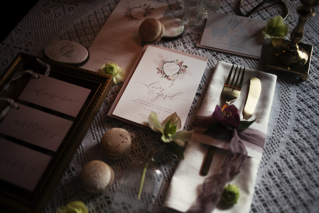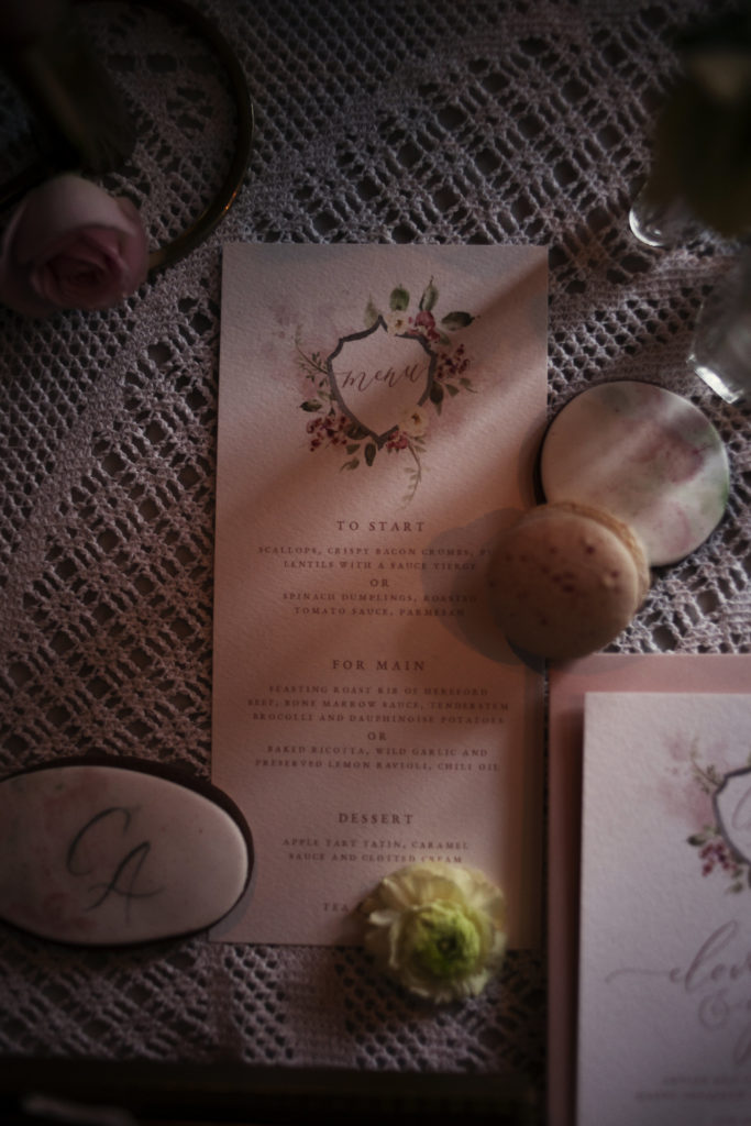 “Spring blossoms inspired the cakes and sweet treats, provided by Sarah Pink Cocoa, and also the bespoke stationery, created by Wonderland Invites. Sarah created a stunning three tier cake, with hand painted watercolour decorations and delicate sugar blossoms floating away from the cake itself. Pretty as picture macaroons were baked especially in pale pink and green tones. Biscuits featured hand painted designs, inspired by the elegant and detailed