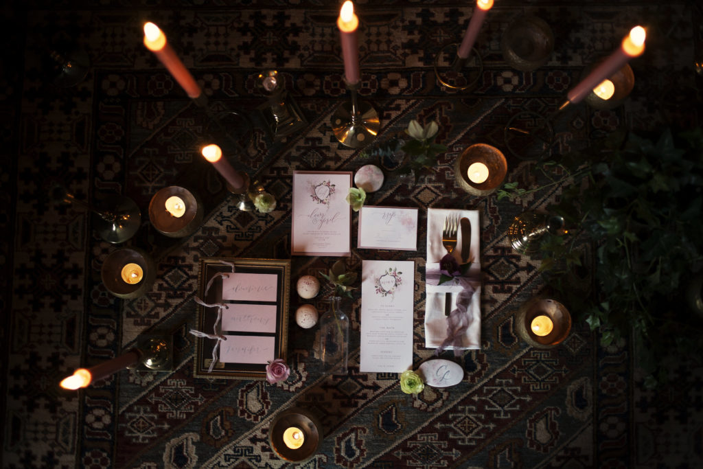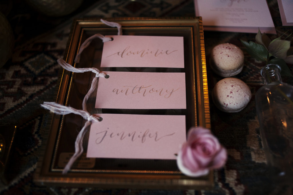 and a beautiful script font to add to the romanticism of the shoot. Place cards were done with hand calligraphy by Wonderland Invites and were adorned with hand-dyed silks from Kate