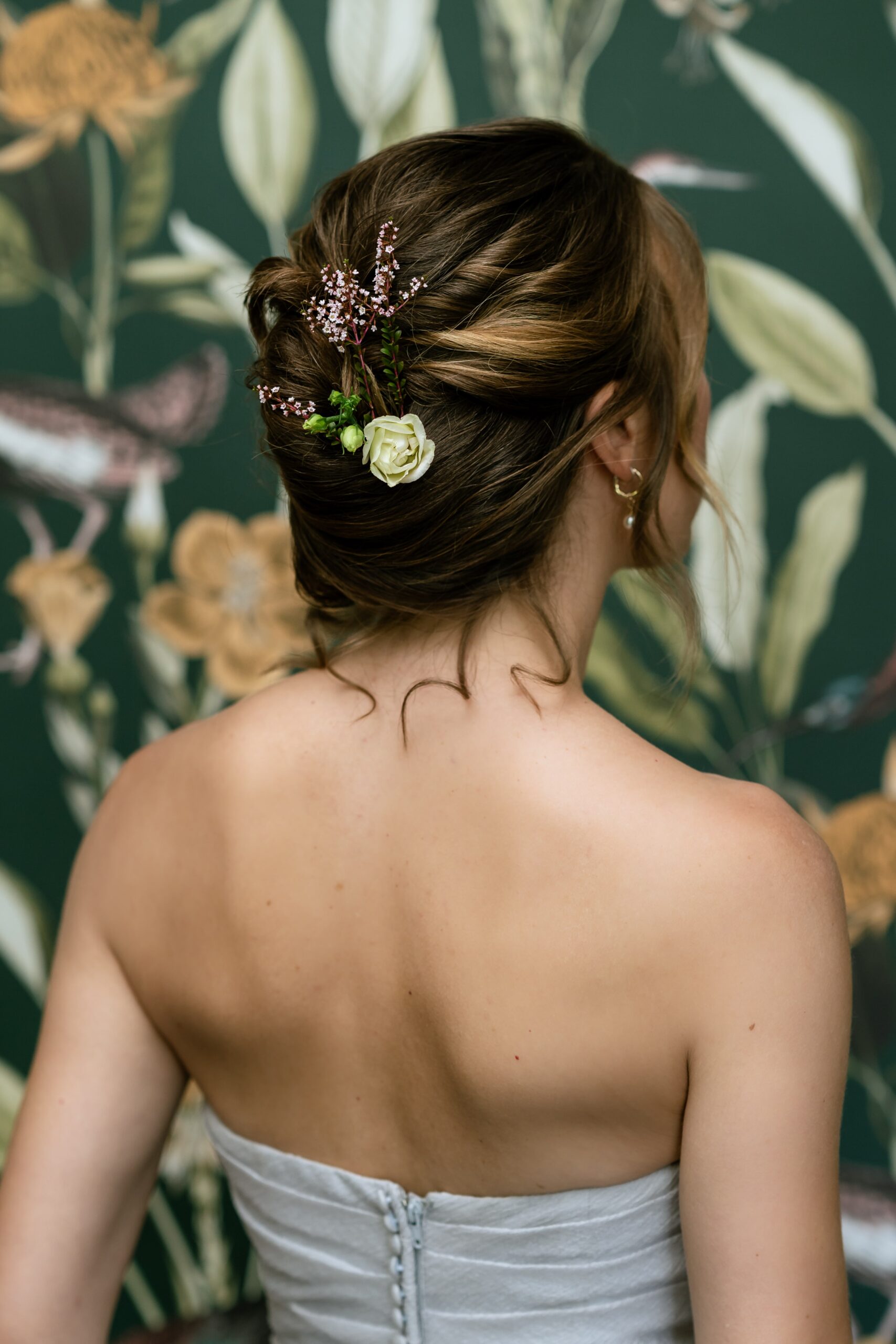 “The bride’s textured organza ballgown by Vera Wang provides a soft, romantic bridal look, with layers that drape like flower petals. The grey colour of the dress adds a moody touch and helps the dress stand out against the white venue while remaining bridal in tone. When choosing your gown, think about how the colour will interact with your venue’s palette and your floral design. A slightly unconventional tone can make a subtle but powerful statement, allowing you to stand out while still feeling timeless.