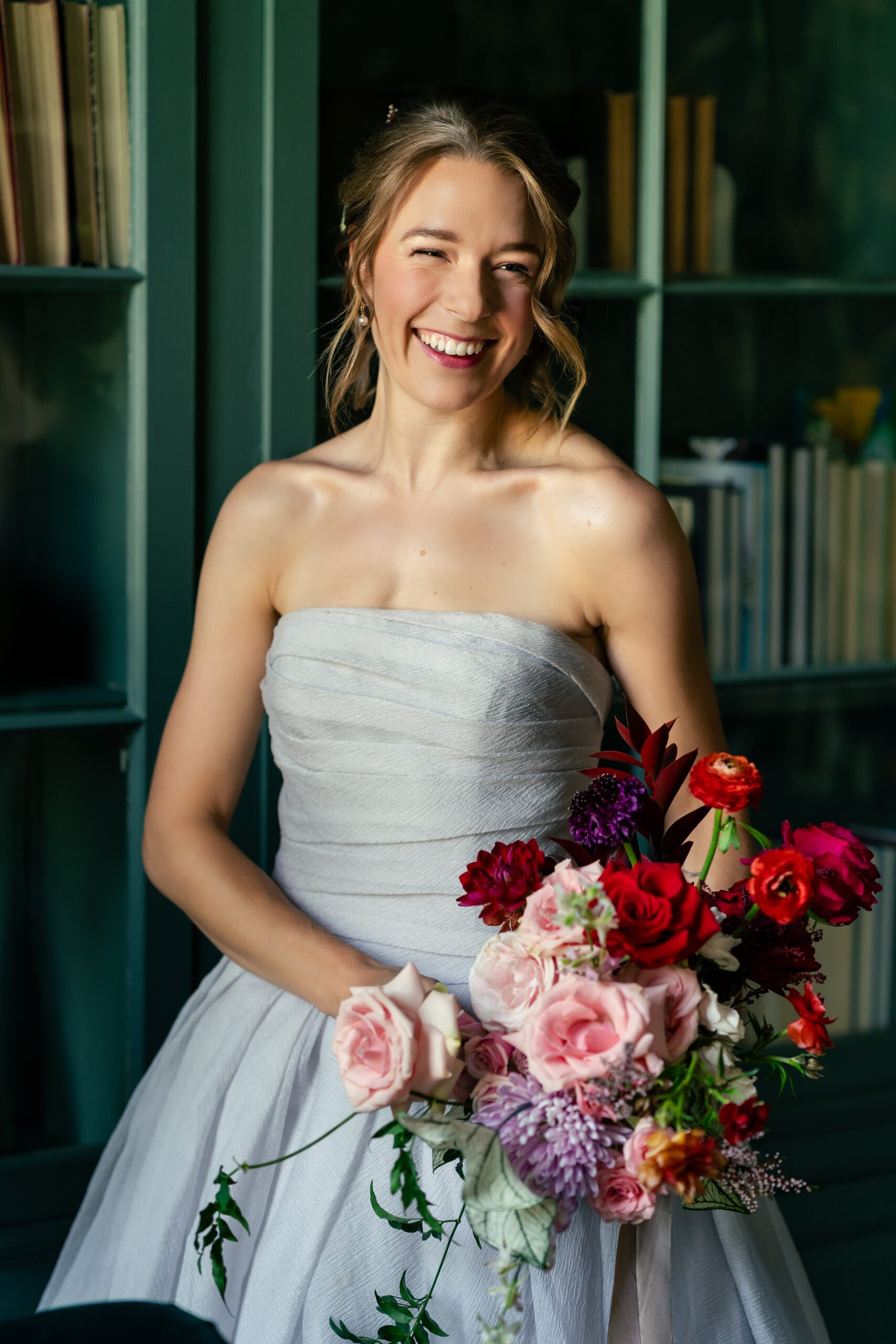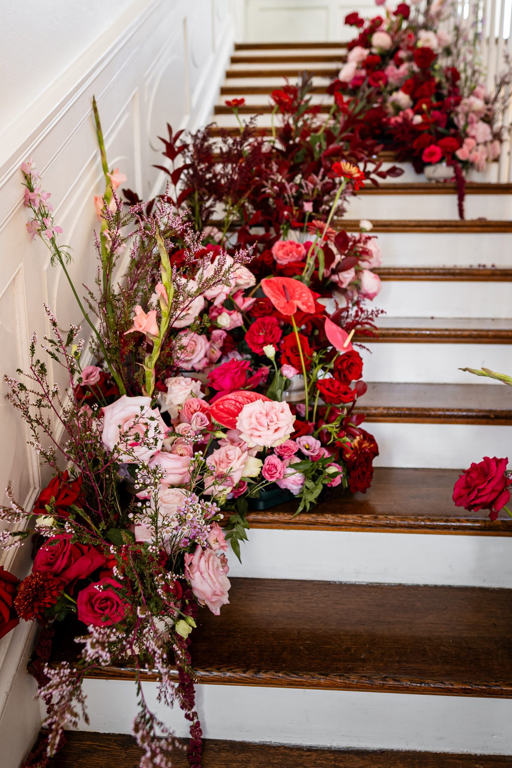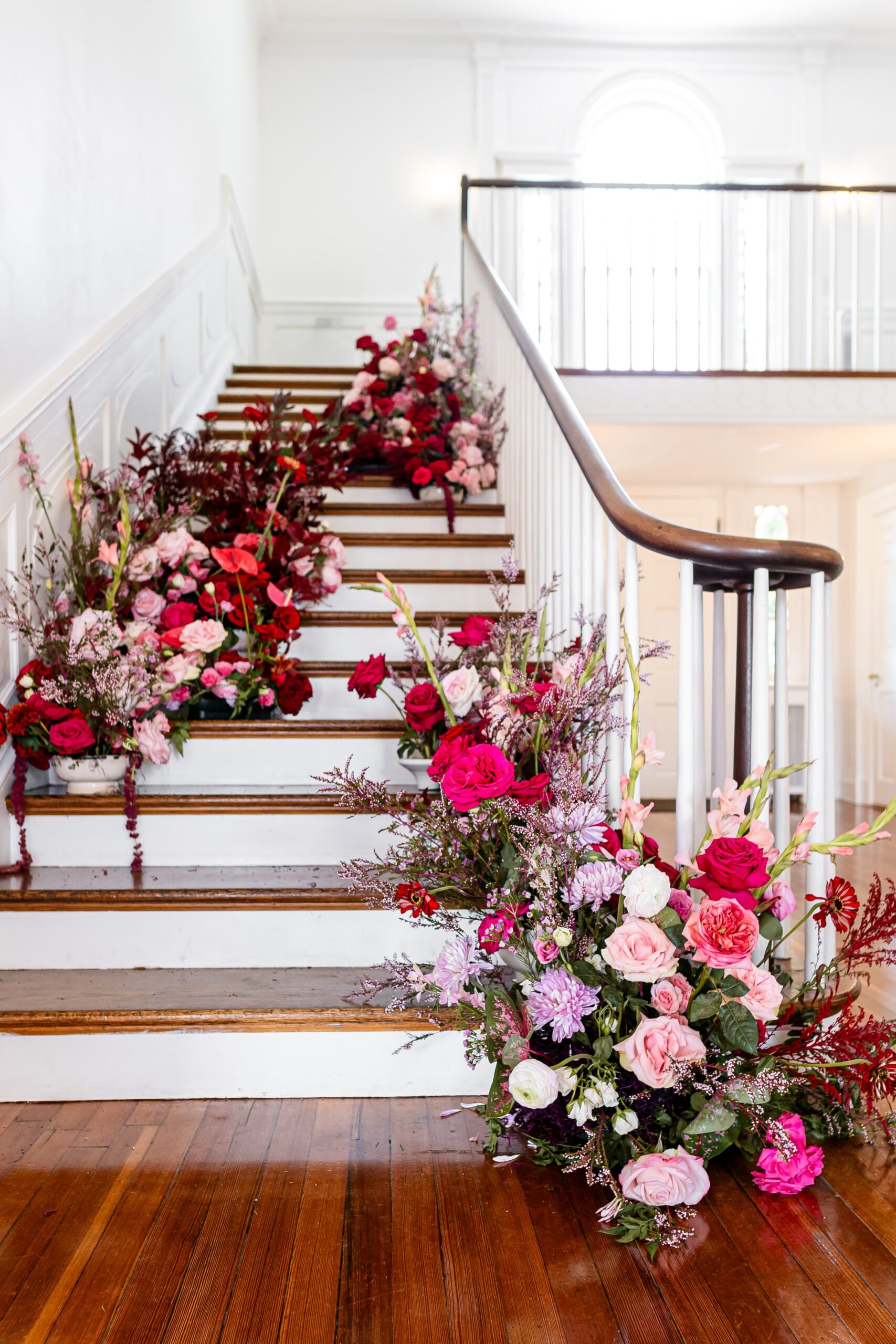 “Inspired by the flower meadow trend, this shoot was designed to take it a step further – literally. A cascade of flowers down the grand staircase of the historic Rust Manor House in Leesburg, Virginia, was the focal point of the shoot. Varying shades of red and pink flowers popped against the neutral-toned foyer of the historic house, while also contrasting stunningly against the moody green library. It was a colour palette straight out of a historical romance novel.”