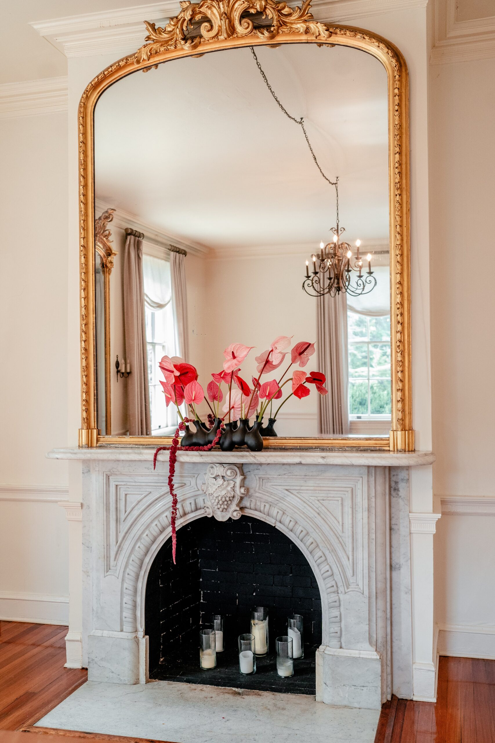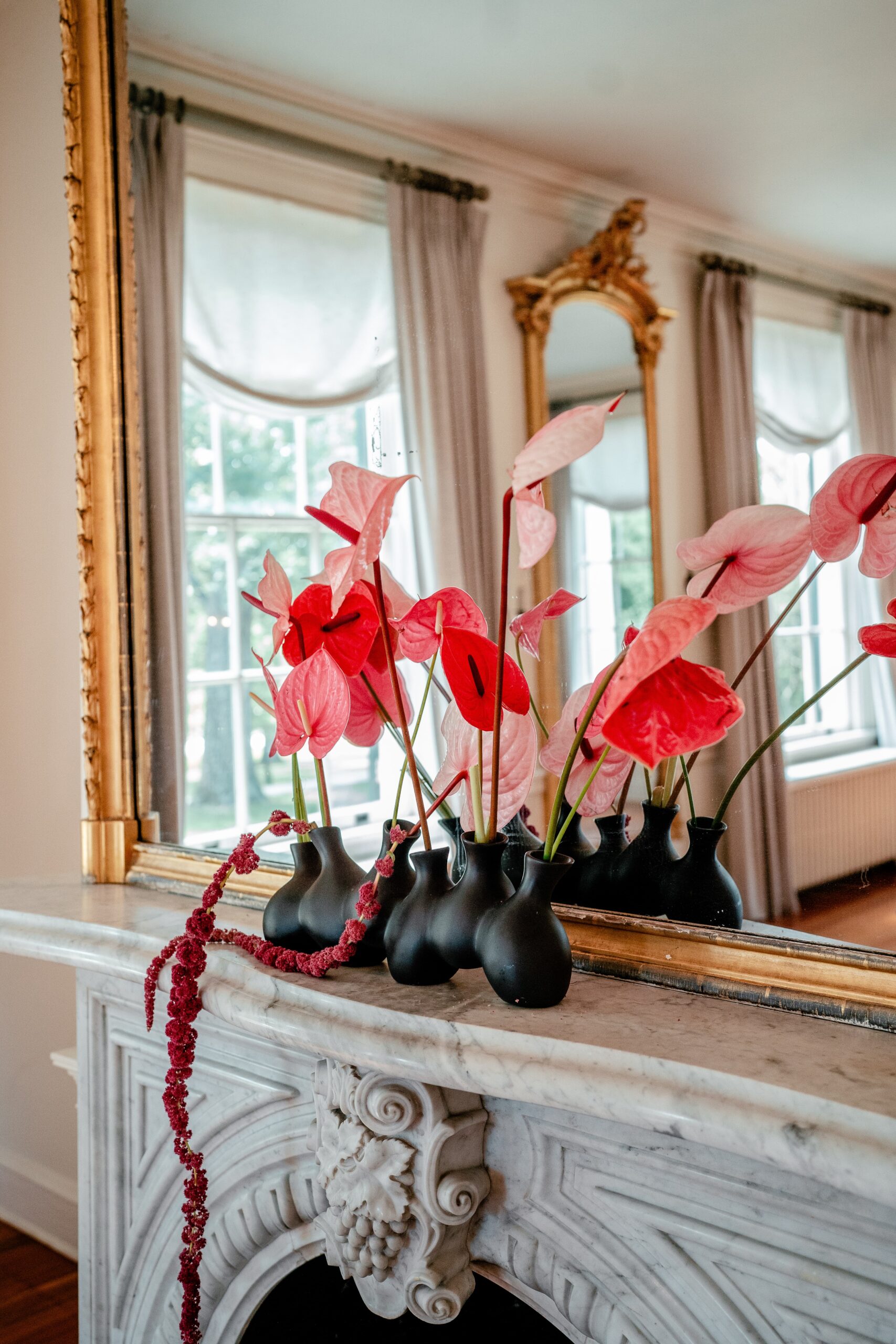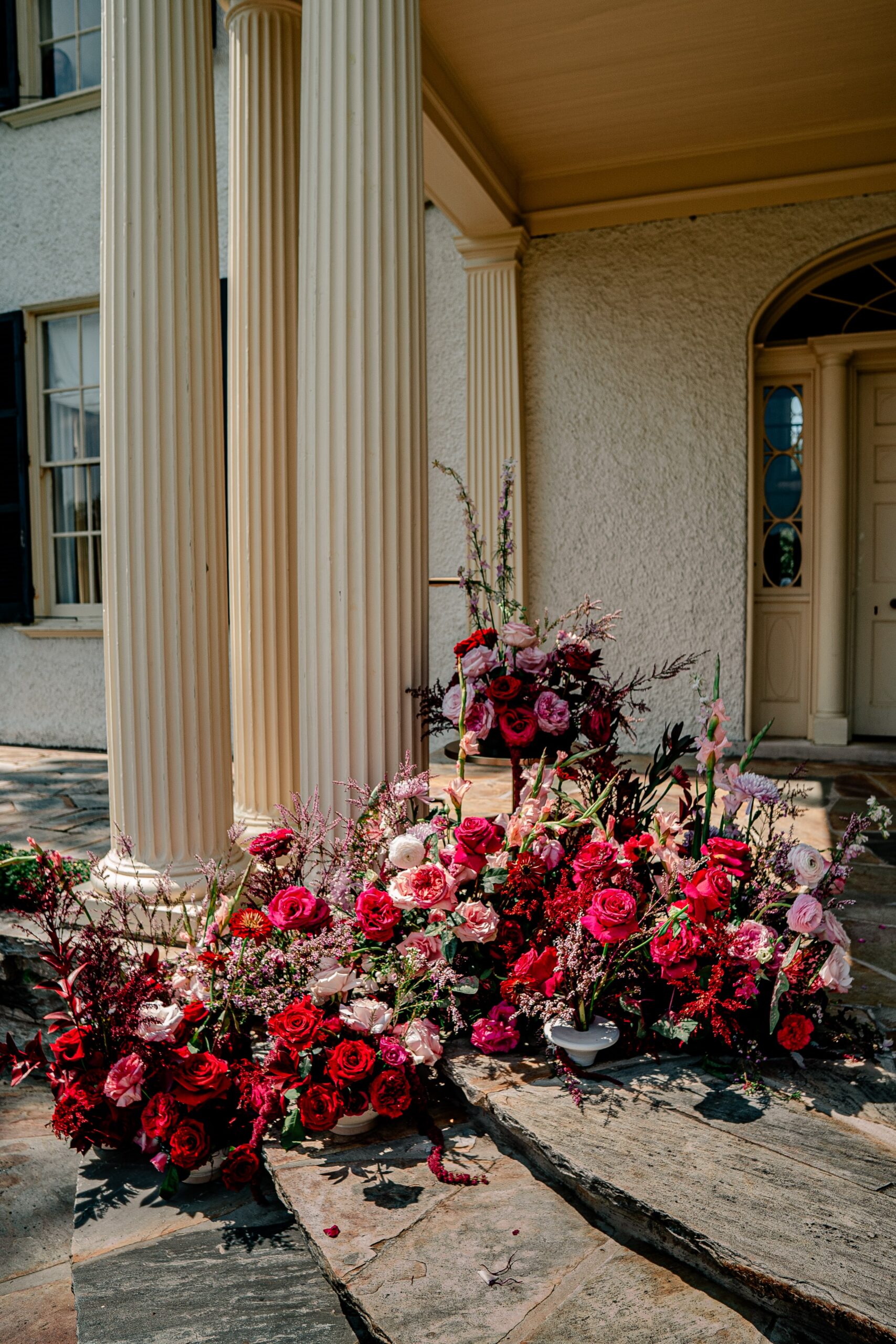 “Inspired by the flower meadow trend, this shoot was designed to take it a step further – literally. A cascade of flowers down the grand staircase of the historic Rust Manor House in Leesburg, Virginia, was the focal point of the shoot. Varying shades of red and pink flowers popped against the neutral-toned foyer of the historic house, while also contrasting stunningly against the moody green library. It was a colour palette straight out of a historical romance novel.”