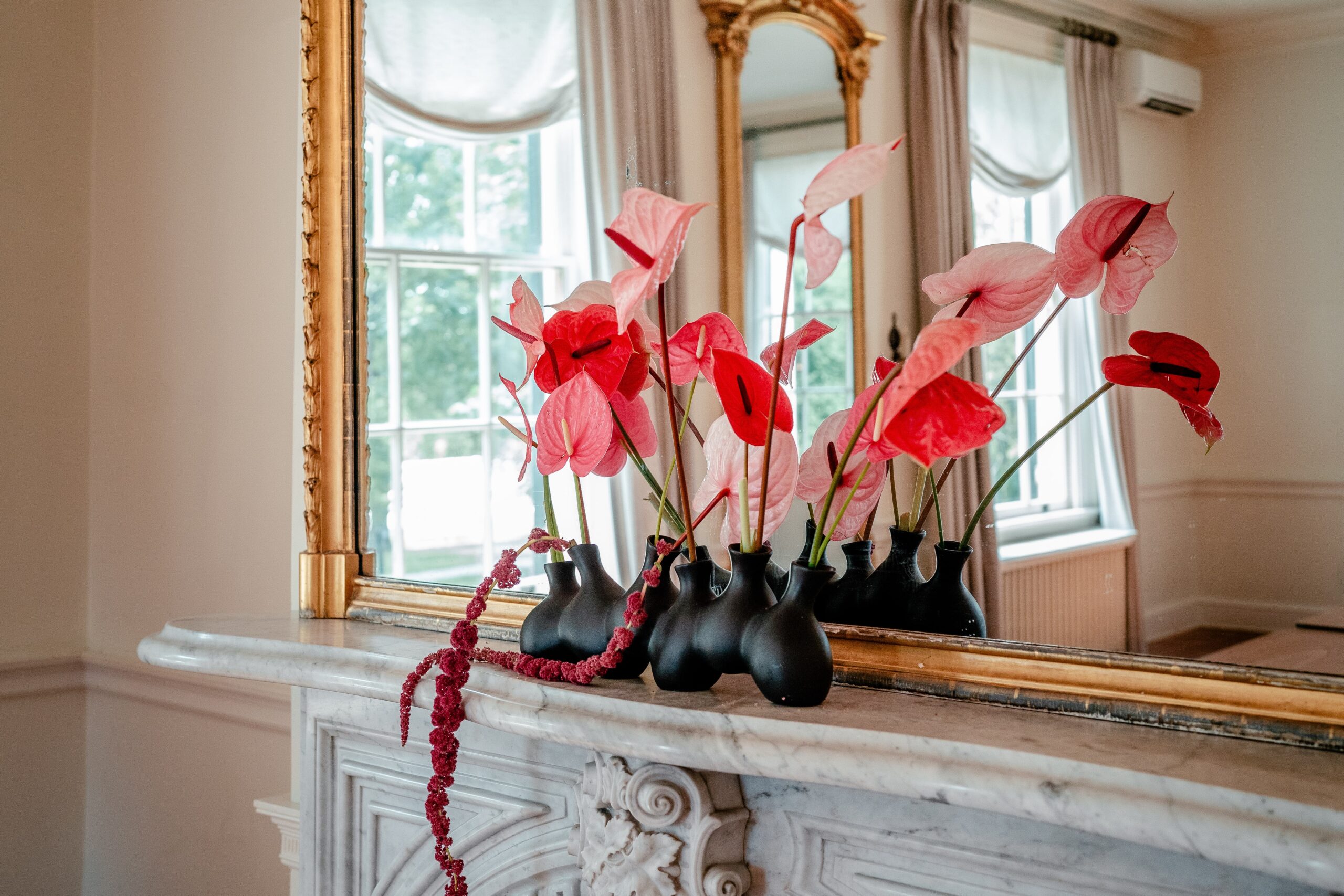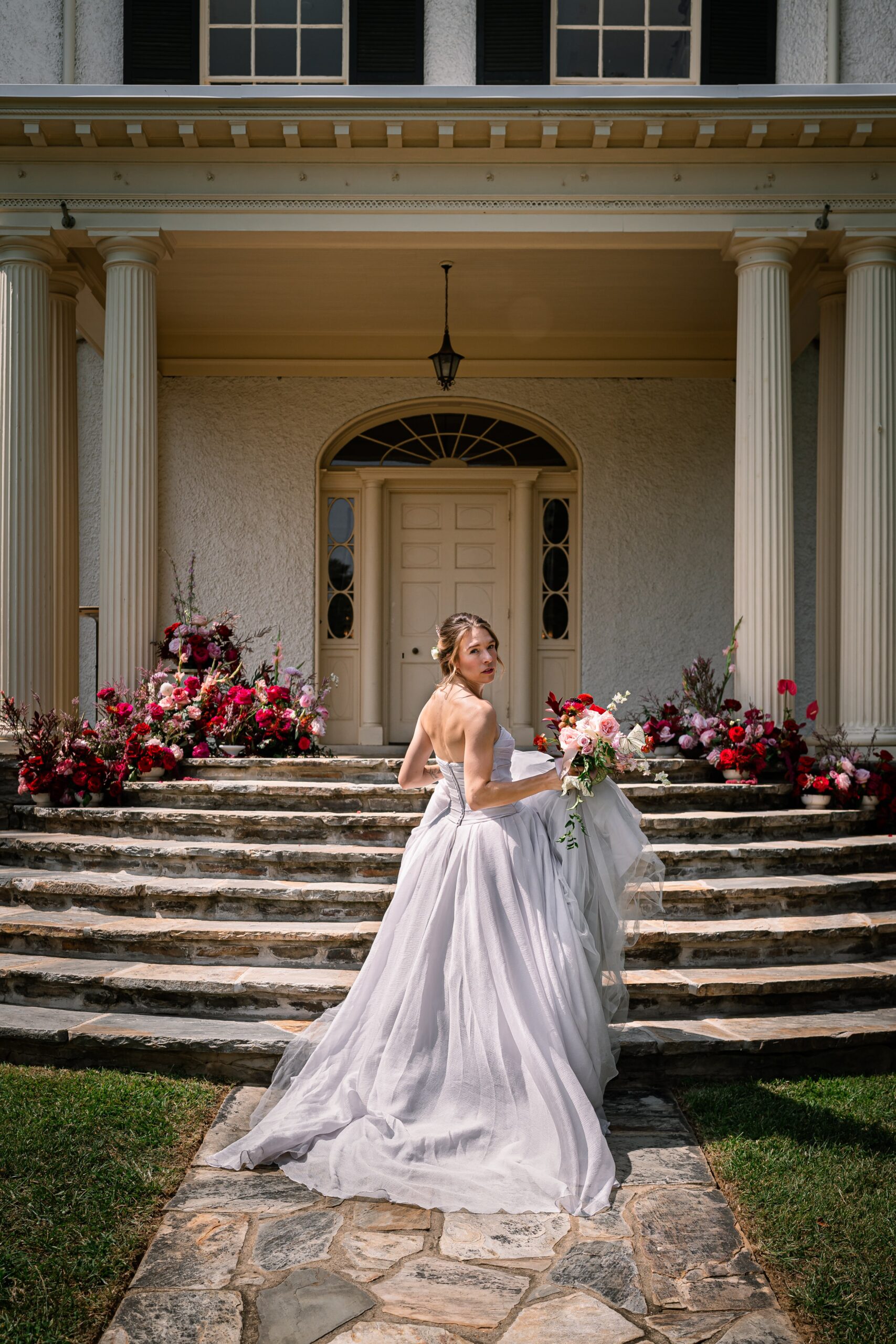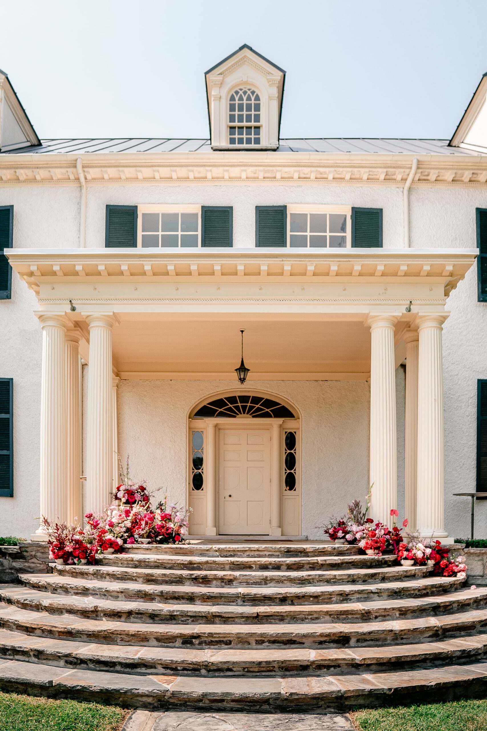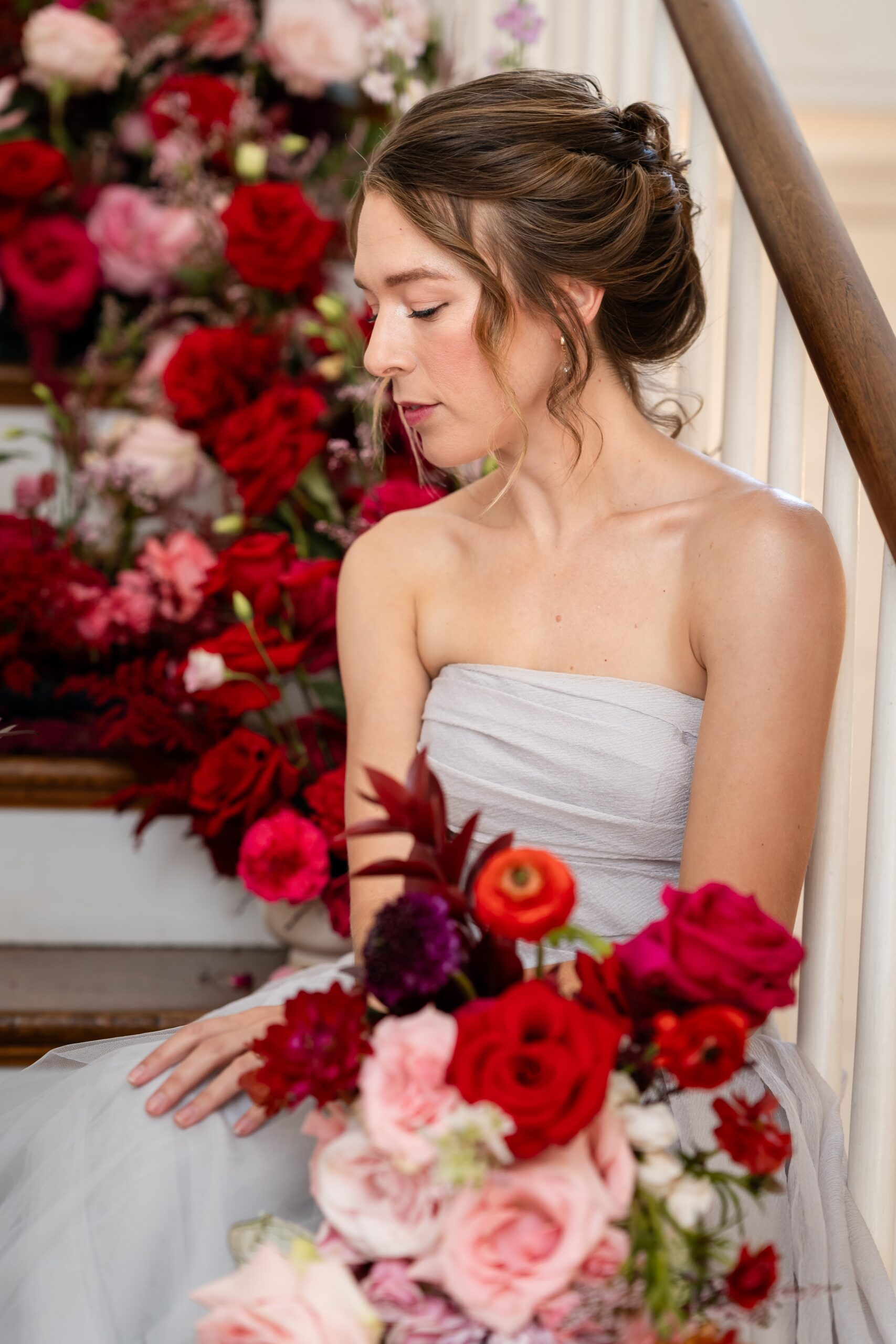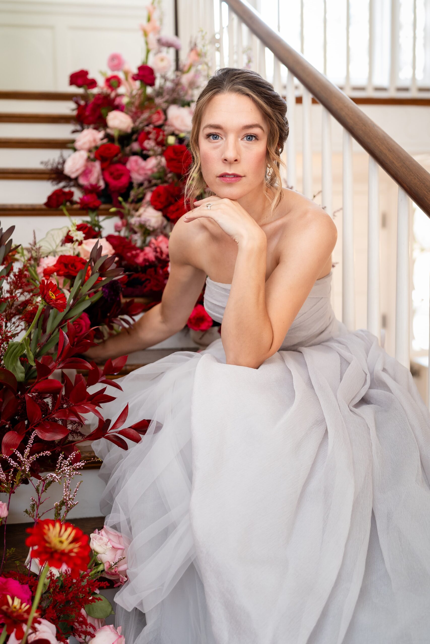 Set at the historic Rust Manor House in Leesburg, Virginia, this bold floral wedding reimagines the flower meadow trend with romantic drama. A cascading floral installation in vibrant reds and pinks flowed down the venue’s grand staircase, popping beautifully against neutral interiors and the moody green library. Curated by coordinator Annika of Floriography and captured by lead photographer Emily of Beauty of the Soul Studio, this shoot is for couples wanting to blend timeless charm with show-stopping florals. From dreamy textures to soft bridal styling, every element offers inspiration for creating a wedding that feels both bold and beautifully romantic.