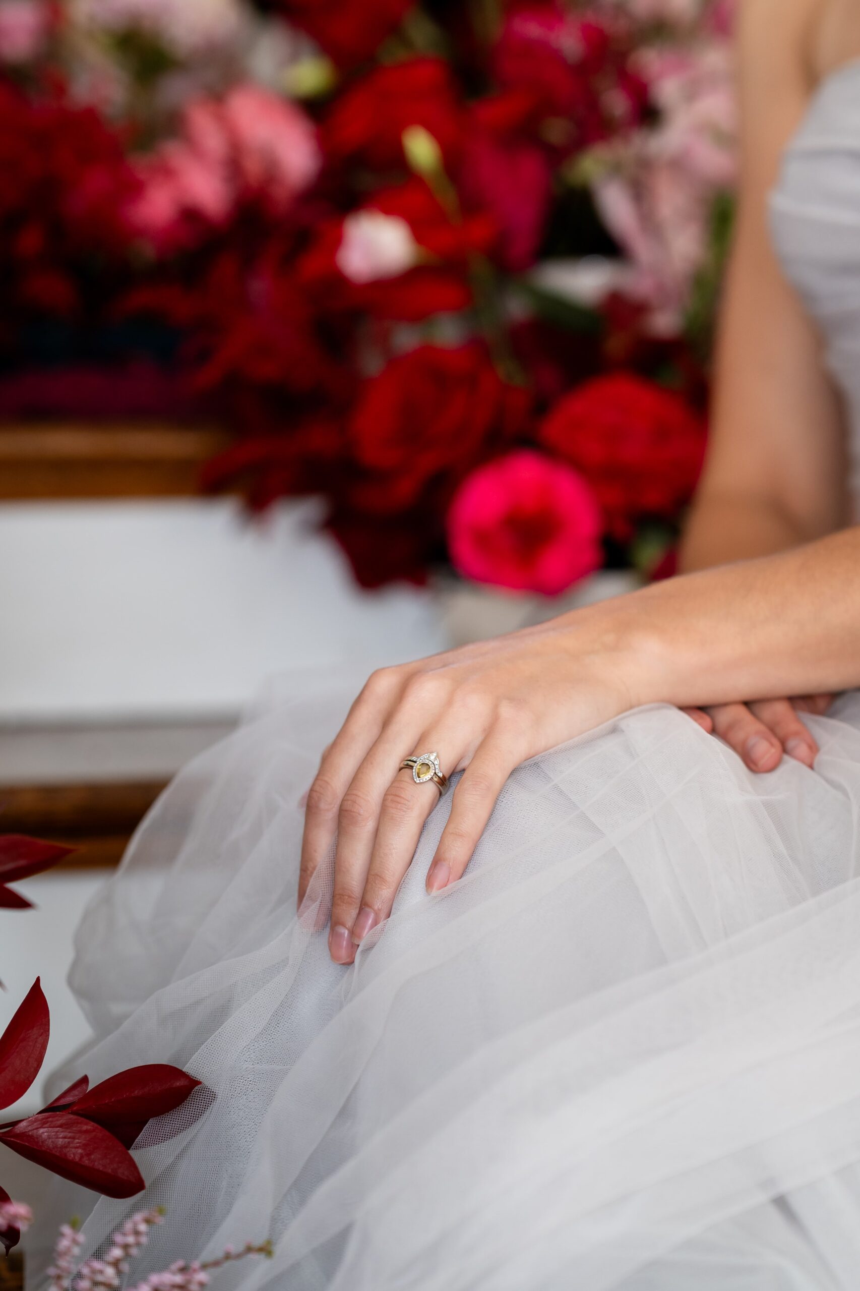 “Vibrant red anthurium, crimson and baby pink roses, scarlet ranunculus, and deep purple asters were just a few of the flowers included in this sweeping display – each one chosen for its texture, depth, and romantic colour story. Couples looking to recreate this look can lean into richly saturated florals. These particular blooms work beautifully together because they offer a range of tones and shapes, creating a layered, almost painterly effect that feels lush and intentional. To carry the theme throughout the wedding day, consider using the same mix of flowers in both your ceremony installation and your bouquet, just as seen here. This approach helps tie different spaces together visually. It’s a subtle but powerful way to ensure your wedding day feels like one cohesive story from beginning to end.”