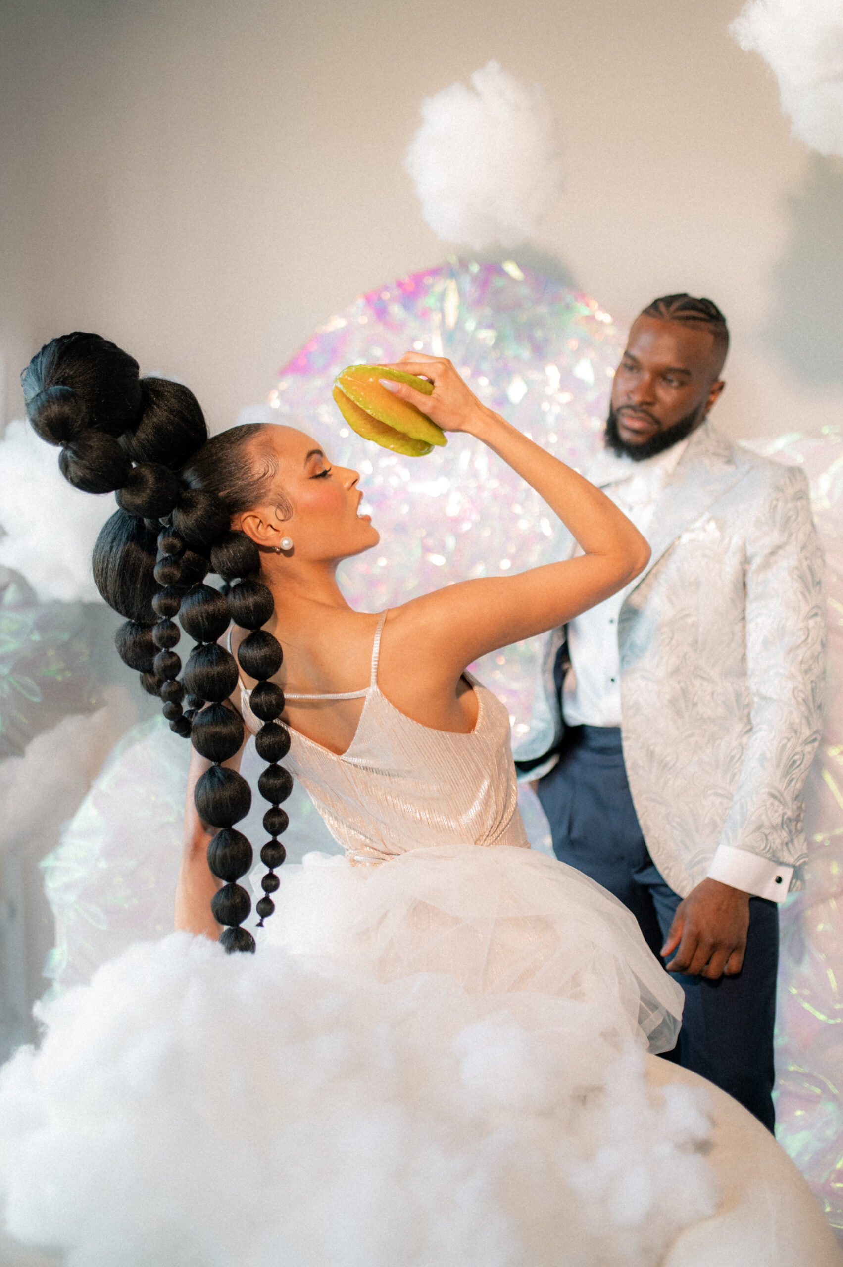 “This editorial shoot took place at a photo studio, perfect for couples looking for pre-wedding shoots. It was thoughtfully curated to inspire modern brides seeking to express their individuality through an artistic lens. Our vision was to challenge conventional wedding norms by incorporating unexpected elements, ethereal set designs, bold and dramatic hairstyles, and non-traditional wedding attire that bring a fresh and imaginative perspective to bridal style.”