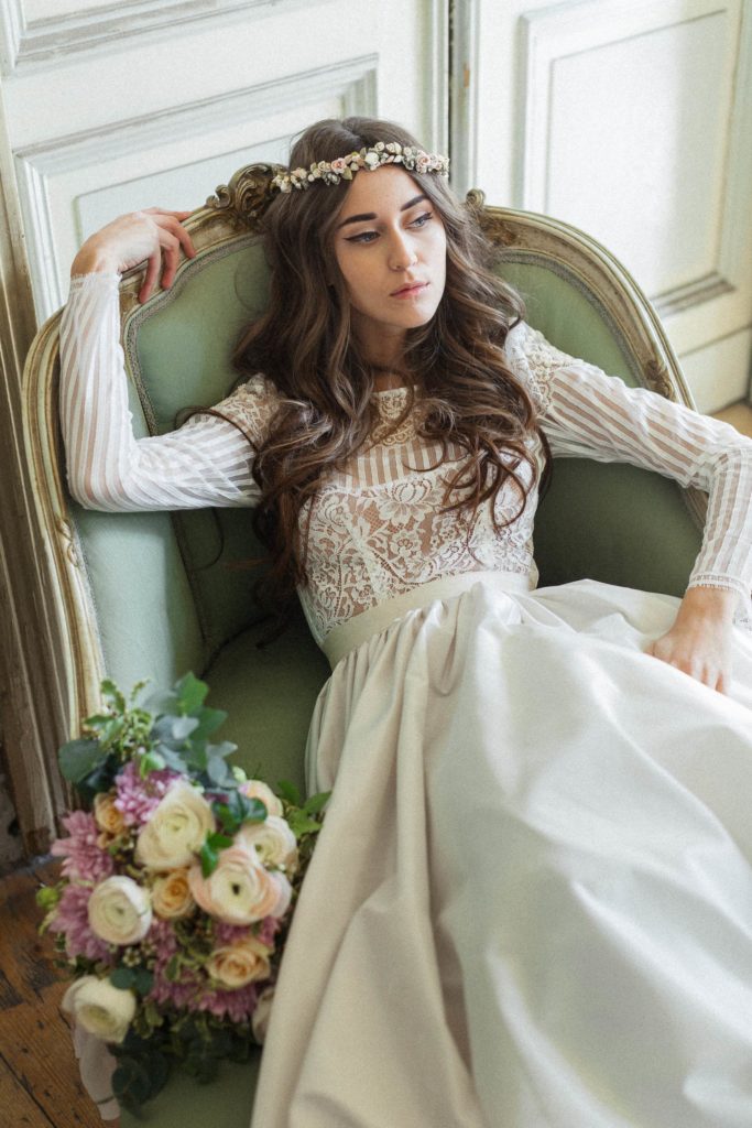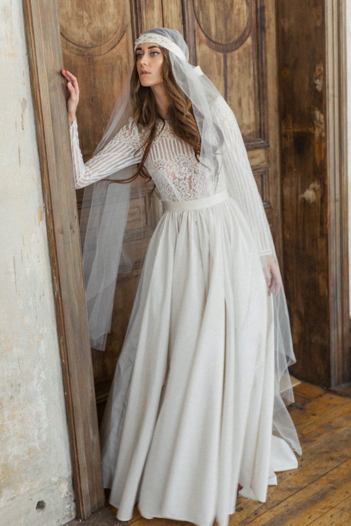 Vintage inspired, worn by todays modern bohemian bride, confidence outshines as self and equally with her partner. French floral, decorative lace and tulle flow with the soft breeze of the Valleys fresh air as the bride stands in a field of wild flowers. Soft flowers trail over the body, joining the gown with hand crafted applique with natural wood and contrasting Swarovski embellishments reflecting the wilderness’s sublime surroundings. Light in nature and in form Katya Shehurina lays the grounds for any romance.