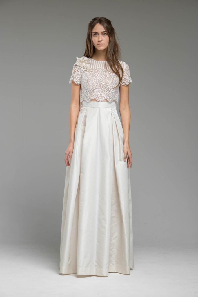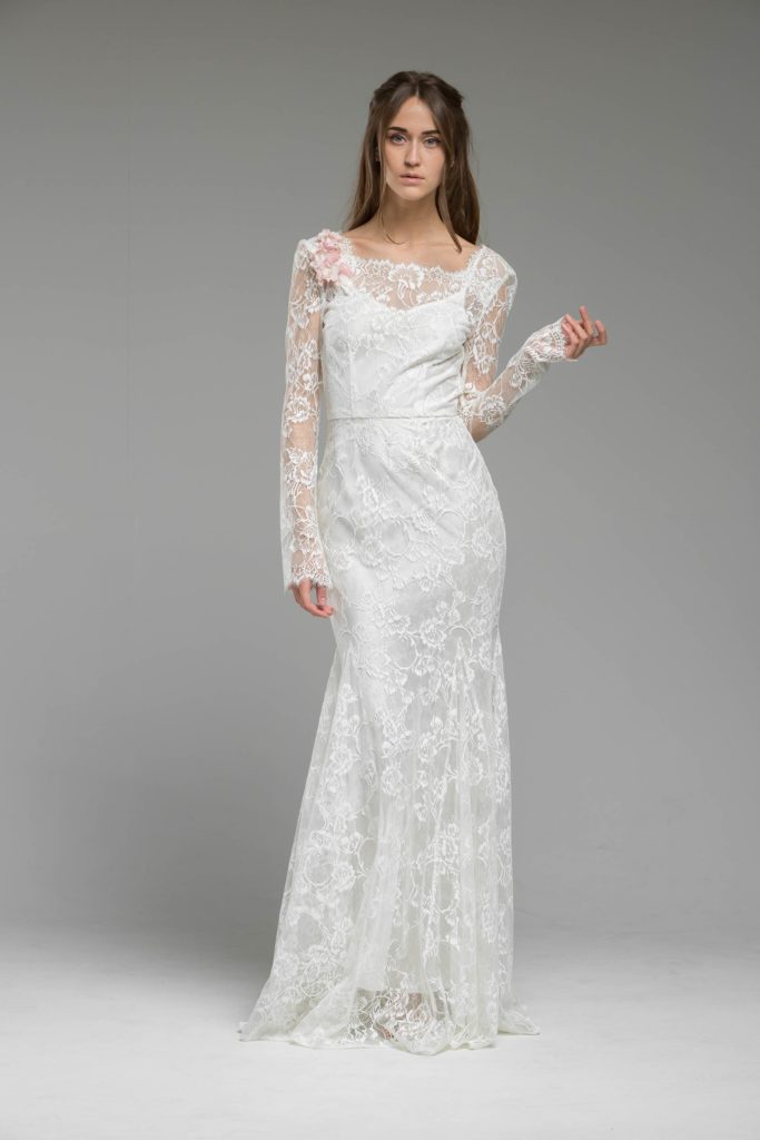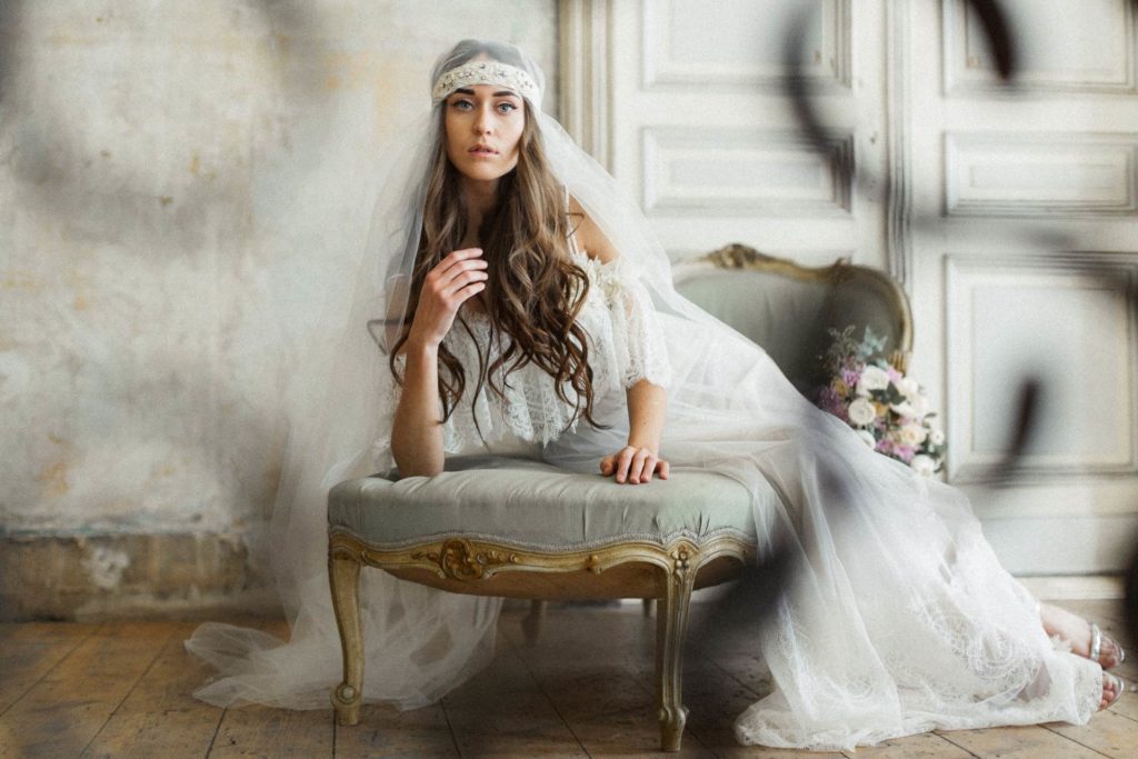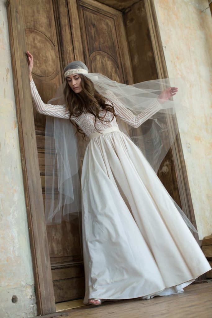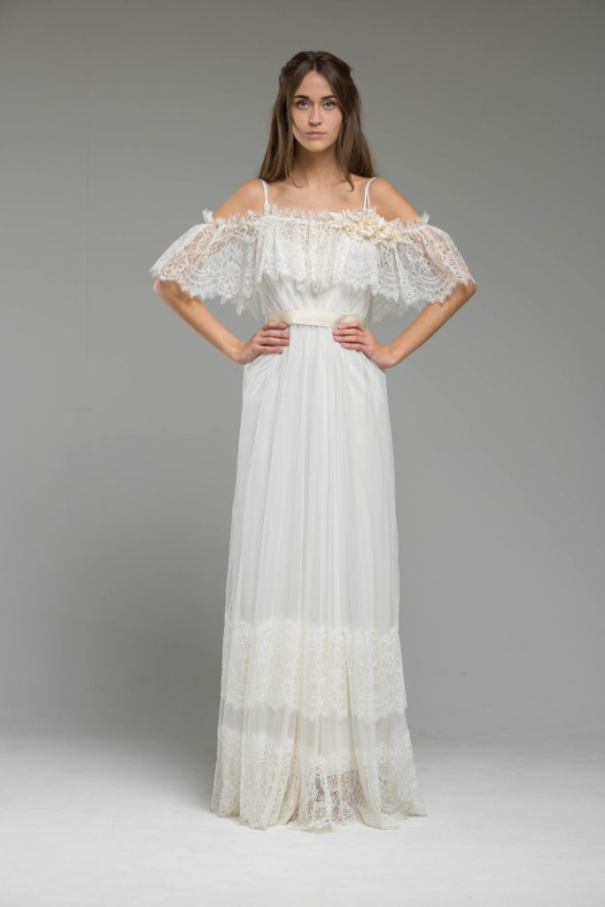 Fresh pastel colours of silk taffeta flowers of the valley rest on the shoulders of the bride, reflecting showers of cherry blossom leaves. Candy pin stripe French lace is a new bold step with Katya’s designs this season elongating the body joint with the crisp scalloped edging of pure decadence. Not forgetting the back detail, Katya frames the back masterfully with baroque style scalloping along with the on-trend bohemian feel of the off-the-shoulder neckline to increase comfort in her already popular unstructured gowns.